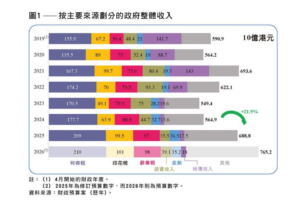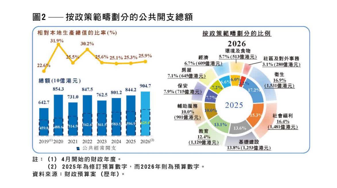 受惠於強勁的股票印花稅收入及發債所得,2025至2026財政年度的政府總收入按年大增21.9%至6,888億港元,令綜合帳目錄得29億港元盈餘,是連續3年錄得赤字後,首次回復財政盈餘。儘管盈餘較政府之前估算提早3年出現,但若扣除發債淨資金,基本赤字仍達1,004億港元,相等於本地生產總值的3%。有關數字仍低於國際貨幣基金組織所追蹤的37個先進經濟體的平均水平(4.6%)。