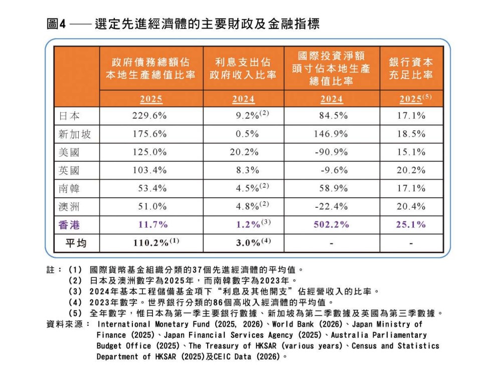 同時,財政司司長亦建議將發債上限由7,000億港元提高至9,000億港元,並提高較長期債券所佔比重。《研究簡報》指出,社會對政府債務走勢的憂慮仍然存在,其中早年發行債券的償還壓力日增,預計由2026至2027至2030至2031財政年度,發債所得的淨資金將減少43.3%,政府債務總額佔本地生產總值的比率亦會升至19.9%。然而,有關比率仍遠低於先進經濟體的平均水平,利息開支亦僅佔政府收入的1.2%。以一系列的金融指標衡量,香港的財政狀況依然穩健,香港的信貸實力在各主要先進經濟體中仍名列前茅。