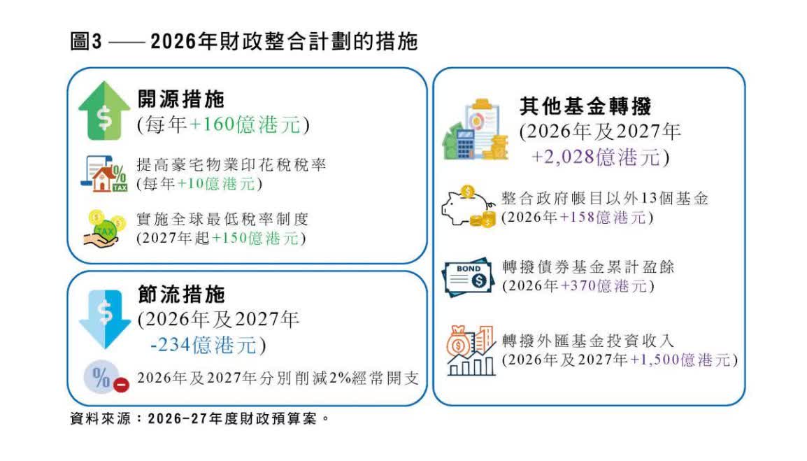 財政司司長在2026至2027財政年度的財政整合計劃中,建議從外匯基金的投資收入中轉撥1,500億港元,以支持北都及其他基建項目,屬42年來首次的轉撥。此舉引起了廣泛討論,有意見認為這或會削弱外匯基金維護香港金融穩定的能力,以及關注會否成為「恆常做法」。與此同時,亦有觀點認為建議是比擴大發債「更安全」的「破格」措施。
