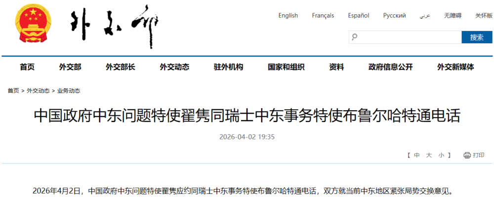2026年4月2日,中國政府中東問題特使翟雋應約同瑞士中東事務特使布魯爾哈特通電話,雙方就當前中東地區緊張局勢交換意見。