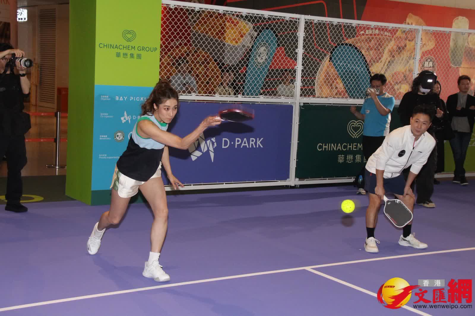 香港文匯報訊(記者 達里)鍾嘉欣與梁業(肥仔)今日出席《華懋匹克球挑戰盃2026》記者會,現場與前國家體操運動員李小鵬一起切磋球技,打得有板有眼的嘉欣爭勝心強烈,不時施展扣殺,但有一次就誤將匹克球擊中隊友李小鵬,幸沒有大礙。