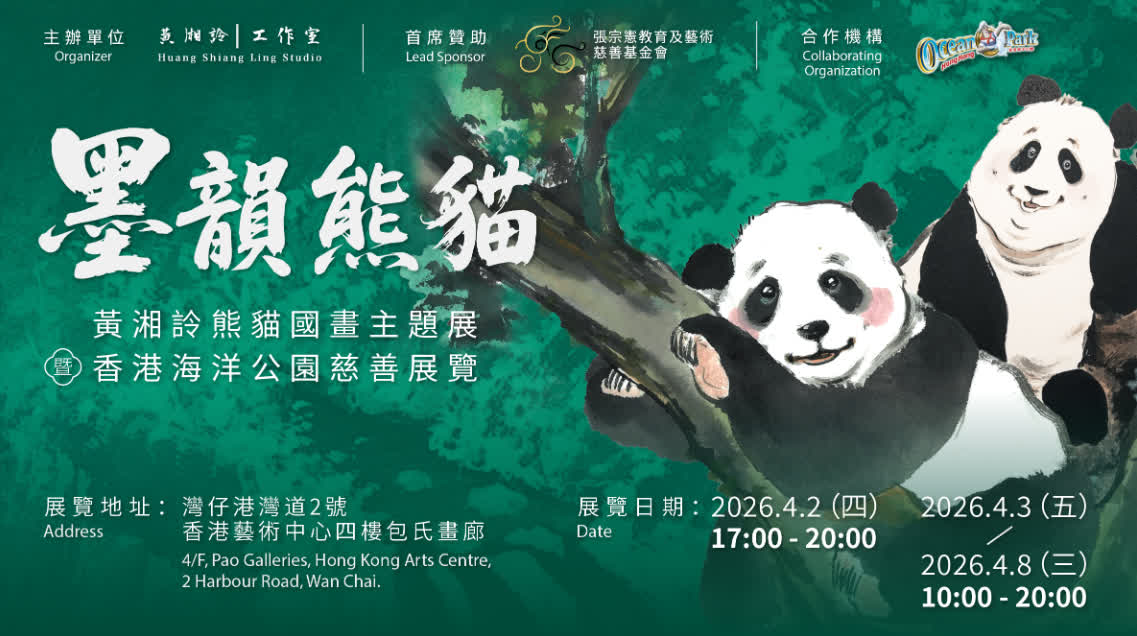 (大公報記者劉毅)近年,香港的國寶大熊貓不斷在本地掀起熱潮,牠們身上的黑與白也恰如中國水墨畫的基本構成。由黃湘詅工作室主辦的「墨韻熊貓──黃湘詅熊貓國畫主題展暨香港海洋公園慈善展覽」即日起在香港藝術中心展至4月8日,展出畫家黃湘詅創作的62幅水墨熊貓作品以及少量山水畫等,傳遞藝術創作保育理念。公眾免費入場。