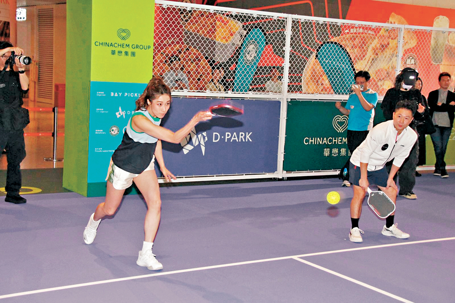 香港文匯報訊(記者 達里)鍾嘉欣與梁業(肥仔)昨日出席「華懋匹克球挑戰盃2026」記者會,現場與前國家體操運動員李小鵬一起切磋球技,打得有板有眼的嘉欣爭勝心強烈,不時施展扣殺,但有一次就誤將匹克球擊中隊友李小鵬,幸沒有大礙。
