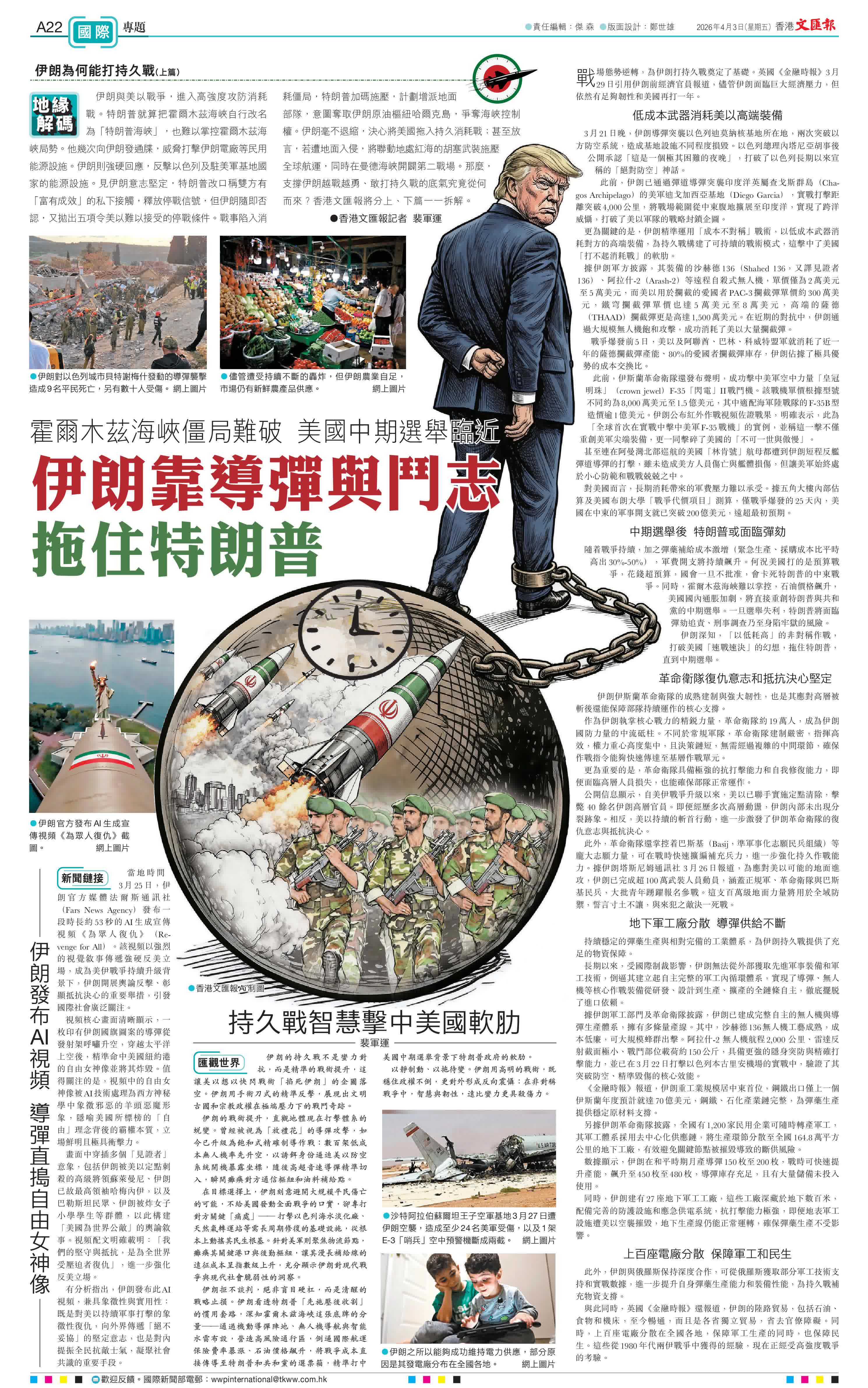 (香港文匯報記者 裴軍運)伊朗與美以戰爭,進入高強度攻防消耗戰。特朗普就算把霍爾木茲海峽自行改名為「特朗普海峽」,也難以掌控霍爾木茲海峽局勢。他幾次向伊朗發通牒,威脅打擊伊朗電廠等民用能源設施。伊朗則強硬回應,反擊以色列及駐美軍基地國家的能源設施。見伊朗意志堅定,特朗普改口稱雙方有「富有成效」的私下接觸,釋放停戰信號,但伊朗隨即否認,又拋出五項令美以難以接受的停戰條件。戰事陷入消耗僵局,特朗普加碼施壓,計劃增派地面部隊,意圖奪取伊朗原油樞紐哈爾克島,爭奪海峽控制權。伊朗毫不退縮,決心將美國拖入持久消耗戰;甚至放言,若遭地面入侵,將聯動地處紅海的胡塞武裝施壓全球航運,同時在曼德海峽開闢第二戰場。那麼,支撐伊朗越戰越勇、敢打持久戰的底氣究竟從何而來?香港文匯報將分上、下篇一一拆解。