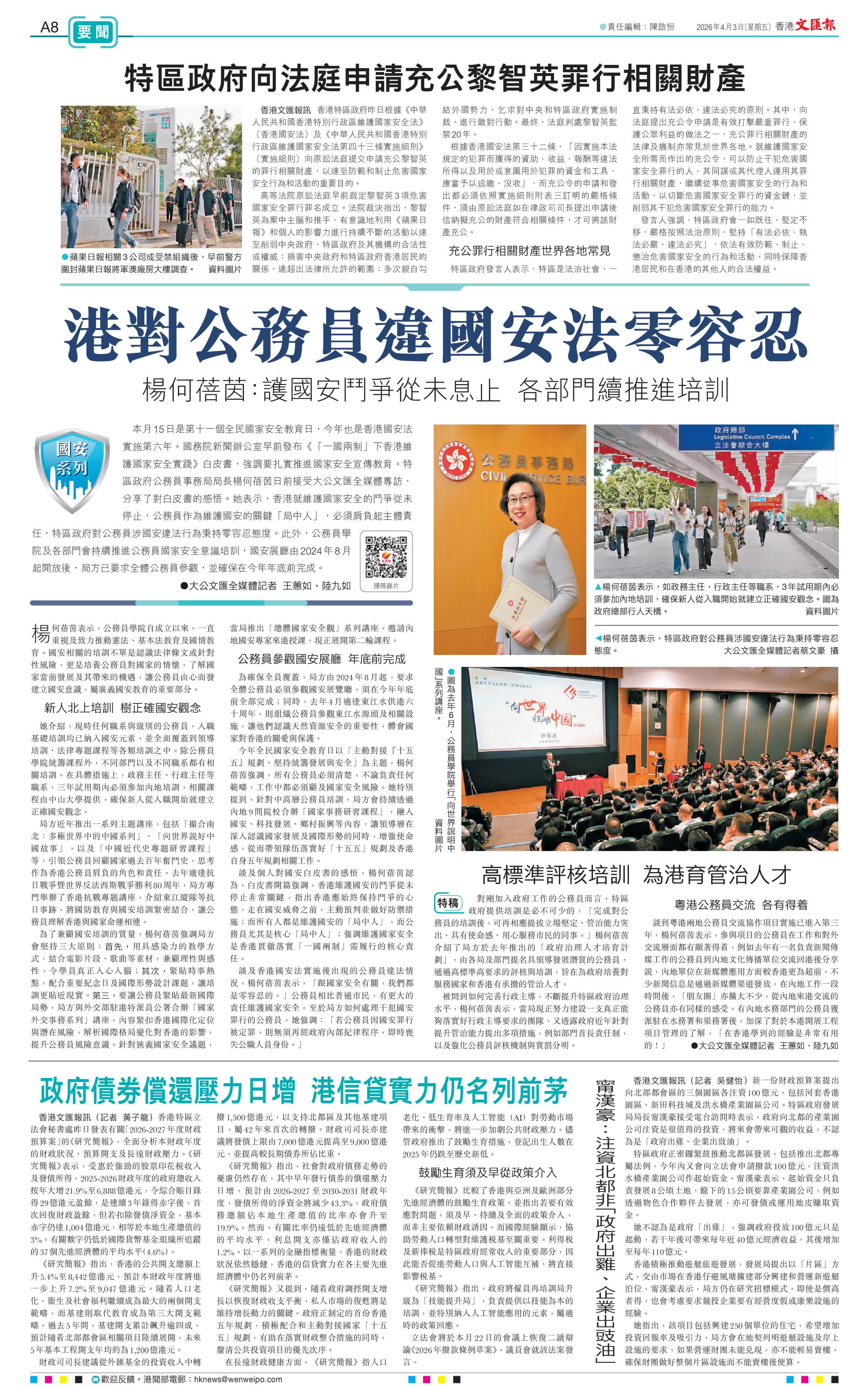 她介紹,現時任何職系與級別的公務員,入職基礎培訓均已納入國安元素,並全面覆蓋到領導培訓、法律專題課程等各類培訓之中。除公務員學院統籌課程外,不同部門以及不同職系都有相關培訓。在具體措施上,政務主任、行政主任等職系,三年試用期內必須參加內地培訓,相關課程由中山大學提供,確保新人從入職開始就建立正確國安觀念。