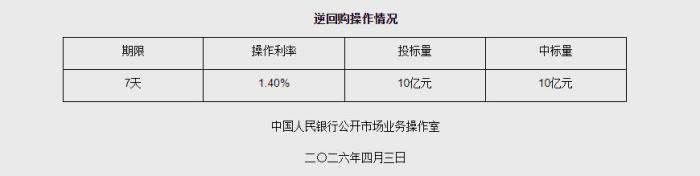 據央行網站消息,2026年4月3日中國人民銀行以固定利率、數量招標方式開展了10億元7天期逆回購操作,全額滿足了一級交易商需求。具體情況如下: