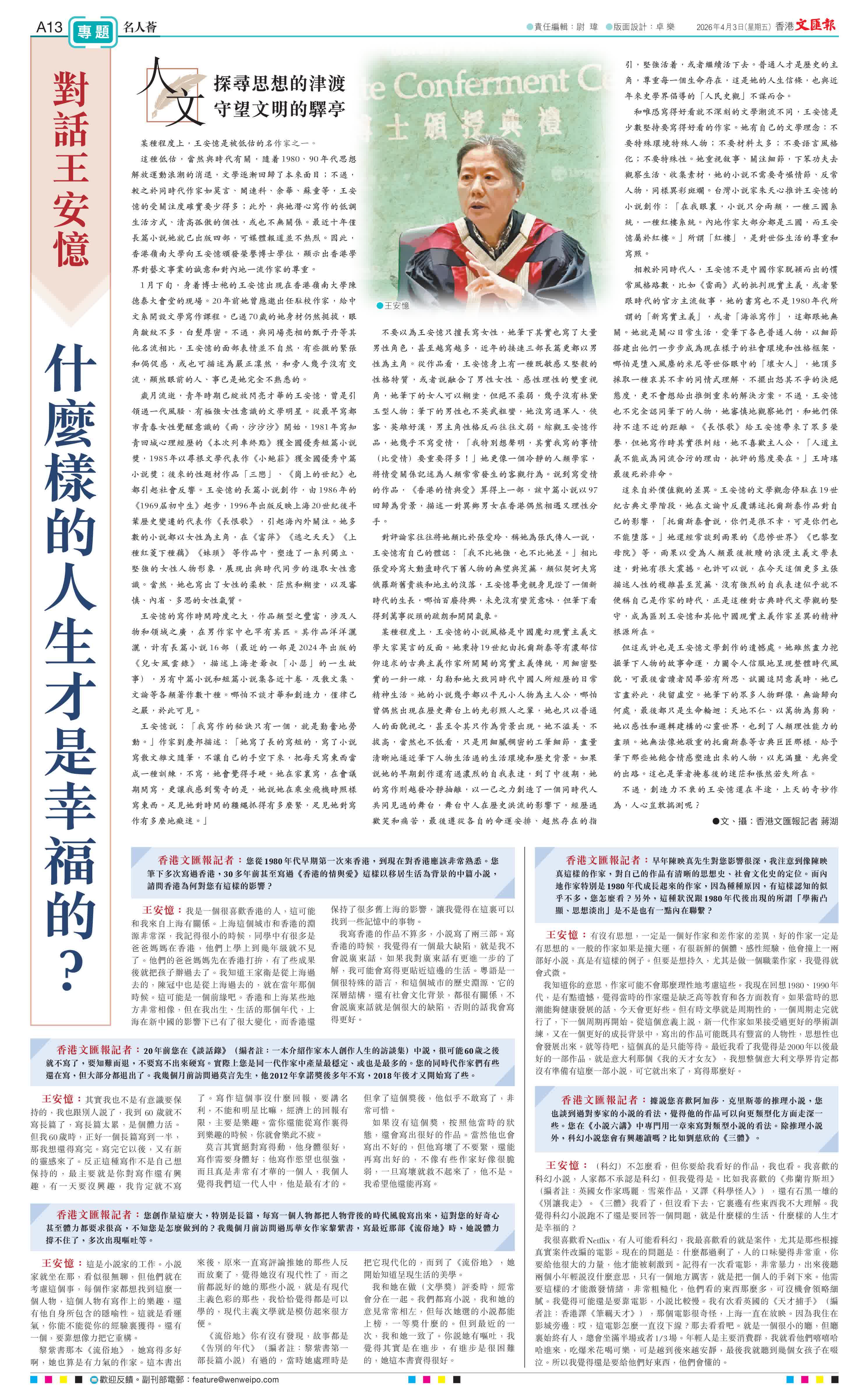 王安憶:我是一個很喜歡香港的人,這可能和我來自上海有關係。上海這個城市和香港的淵源非常深,我記得很小的時候,同學中有很多是爸爸媽媽在香港,他們上學上到幾年級就不見了。他們的爸爸媽媽先在香港打拚,有了些成果後就把孩子辦過去了。我知道王家衛是從上海過去的,陳冠中也是從上海過去的,就在當年那個時候。這可能是一個前緣吧。香港和上海某些地方非常相像,但在我出生、生活的那個年代,上海在新中國的影響下已有了很大變化,而香港還保持了很多舊上海的影響,讓我覺得在這裏可以找到一些記憶中的事物。