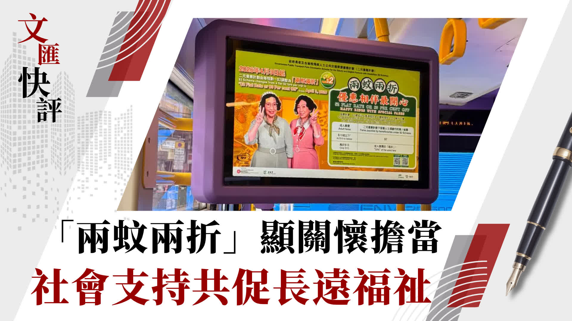 「二元優惠計劃」調整為「兩蚊兩折」於今日(4月3日)正式實施。勞工及福利局局長孫玉菡親赴調景嶺視察及宣傳,期間呼籲長者避免「長車短搭」,同時強調跨區的長途車「當然應搭則搭」。這一番說話,既點出了計劃調整的核心考量,亦展現了特區政府對長者出行需要的充分理解與尊重,值得社會理解、支持與配合。