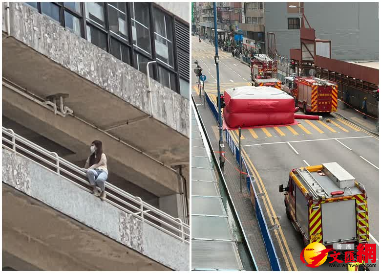 消防接報趕至,隨即張開氣墊戒備,同時救援人員登上停車場高層向事主展開游說。