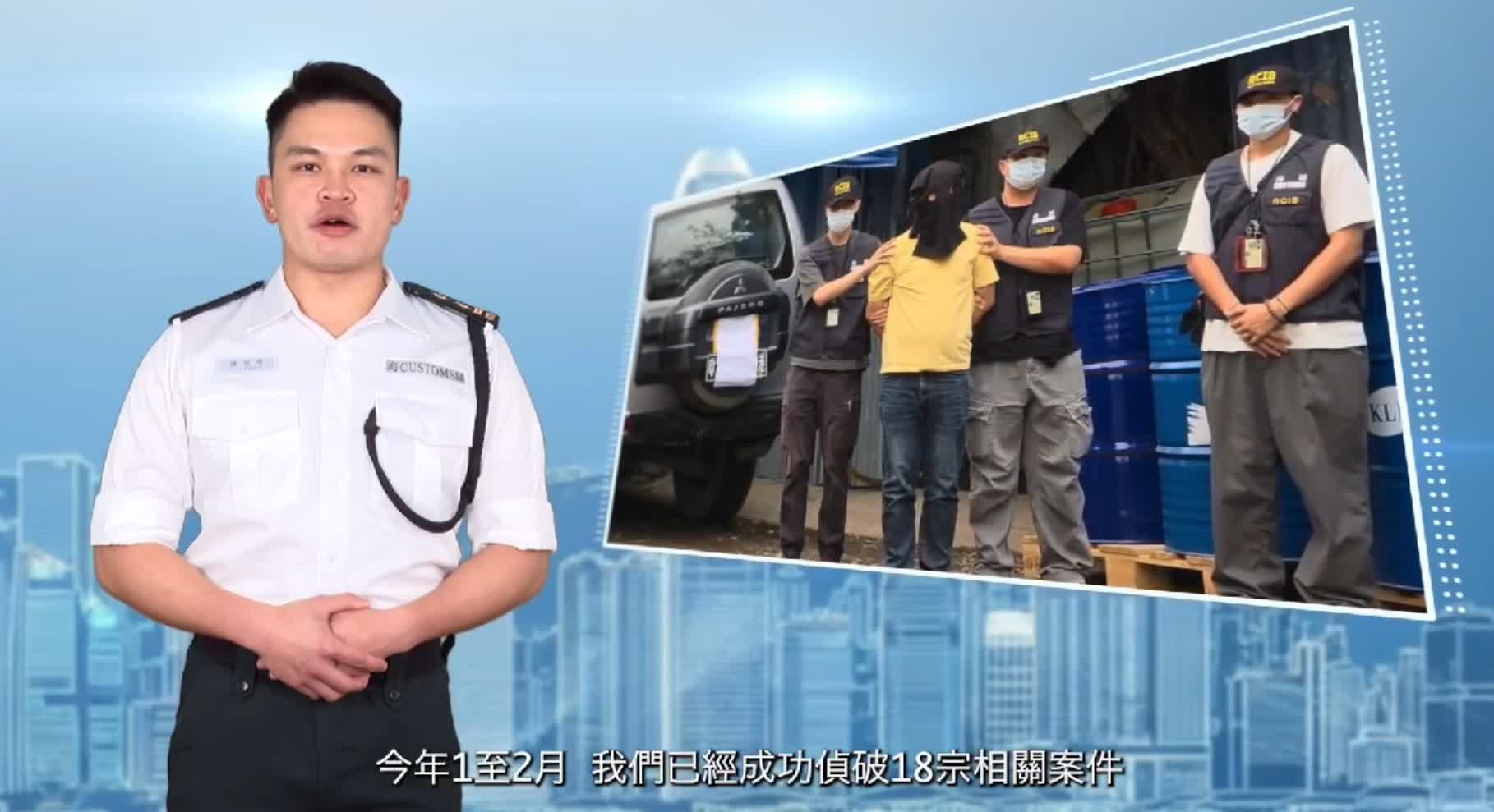 香港海關表示,一直採取嚴厲執法行動打擊非法燃油活動,今年1月至2月,海關成功偵破18宗案件,拘捕17人,較去年同期分別上升一倍及2.4倍。