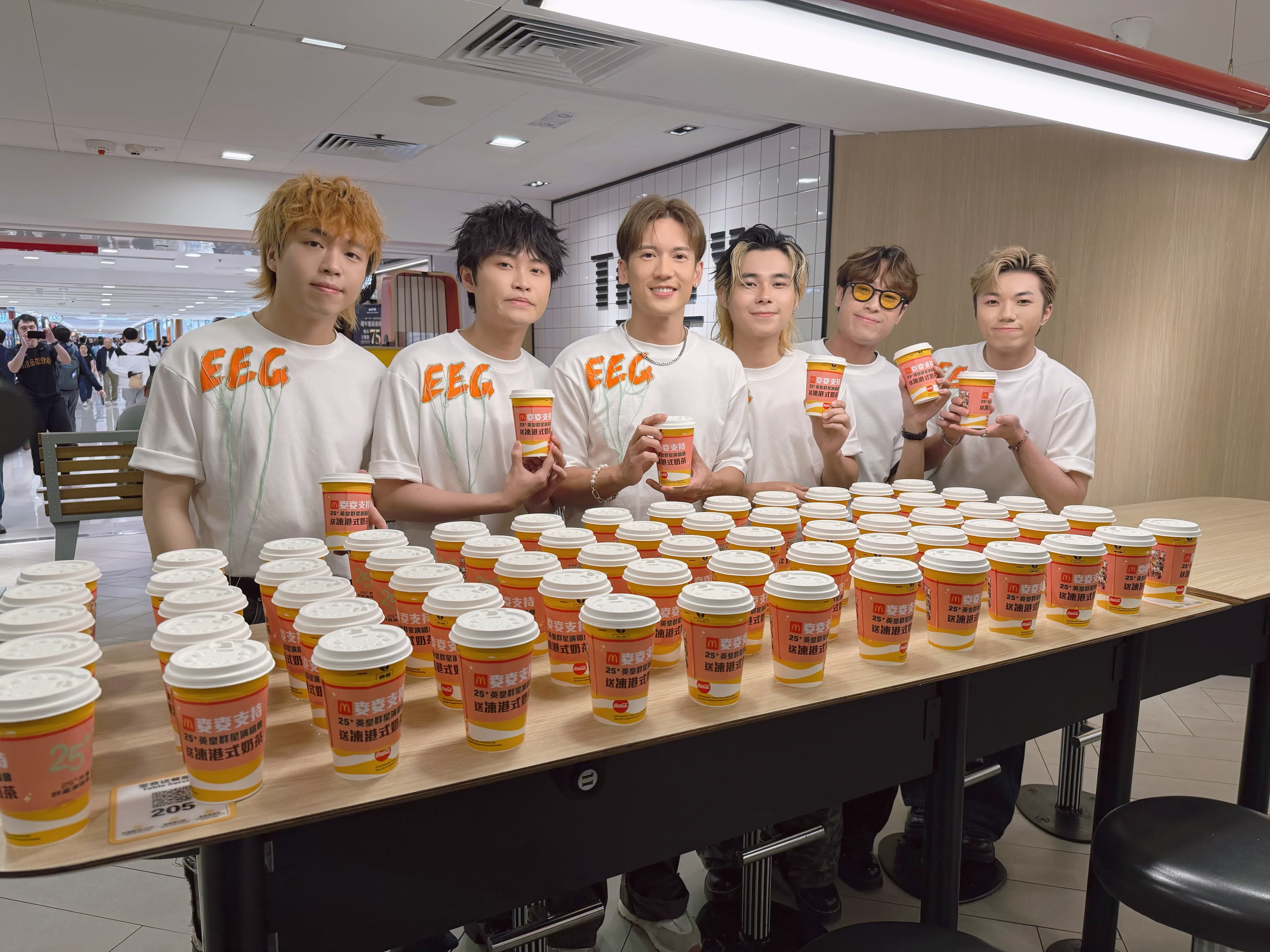 香港文匯報訊(記者 達里)距離「25+英皇群星演唱會」仍有一個月時間,相關演出藝人繼續落力宣傳,繼早前張敬軒、李幸倪、Twins殺入快餐店後,今次輪到關智斌(Kenny)跟樂隊Locksmiths(開鎖佬)落區派奶茶,Kenny一出現即引來顧客包圍拍照,有求必應的他亦逐一自拍留念,Locksmiths也一邊派奶茶、一邊跟顧客自拍搞氣氛。
