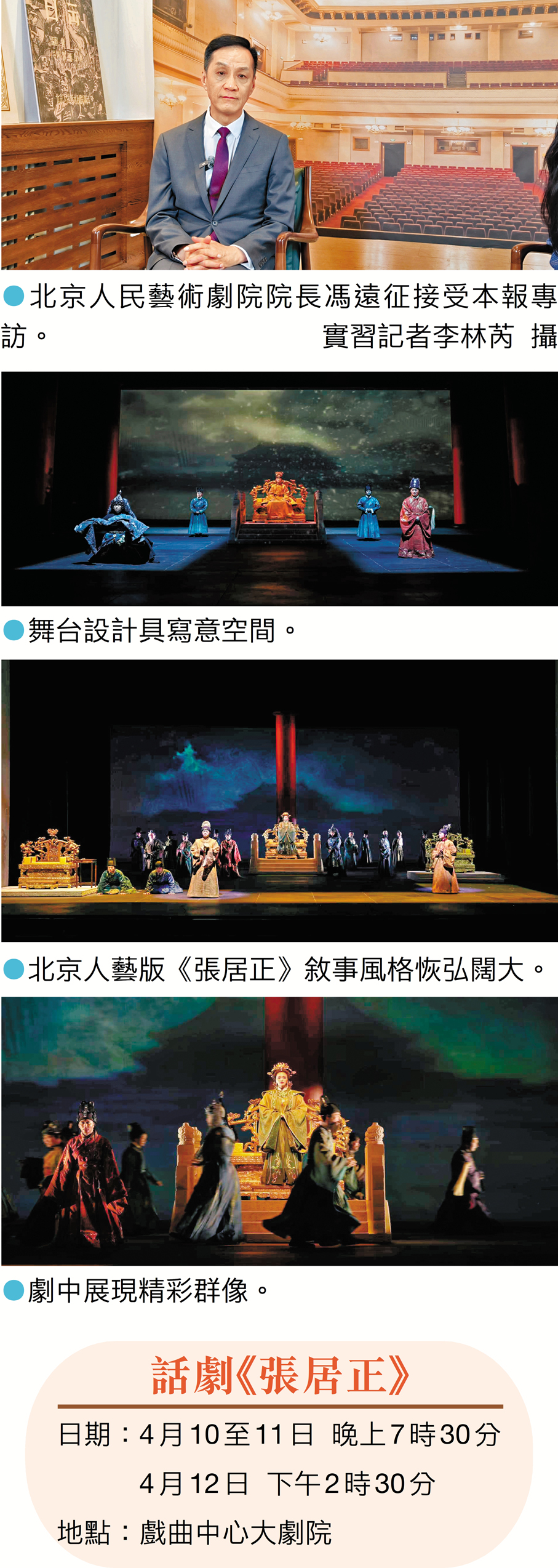 近日,這部作品中張居正的扮演者、著名表演藝術家、北京人民藝術劇院院長馮遠征在北京接受了香港文匯報的獨家專訪。他表示,這次會將原汁原味的人藝大戲帶給香港觀眾,相信香港的朋友們一定會非常喜歡這部作品,並且在觀演之後受到觸動和啟發。 ●文:香港文匯報記者 張寶峰、朱燁,實習記者 李林芮