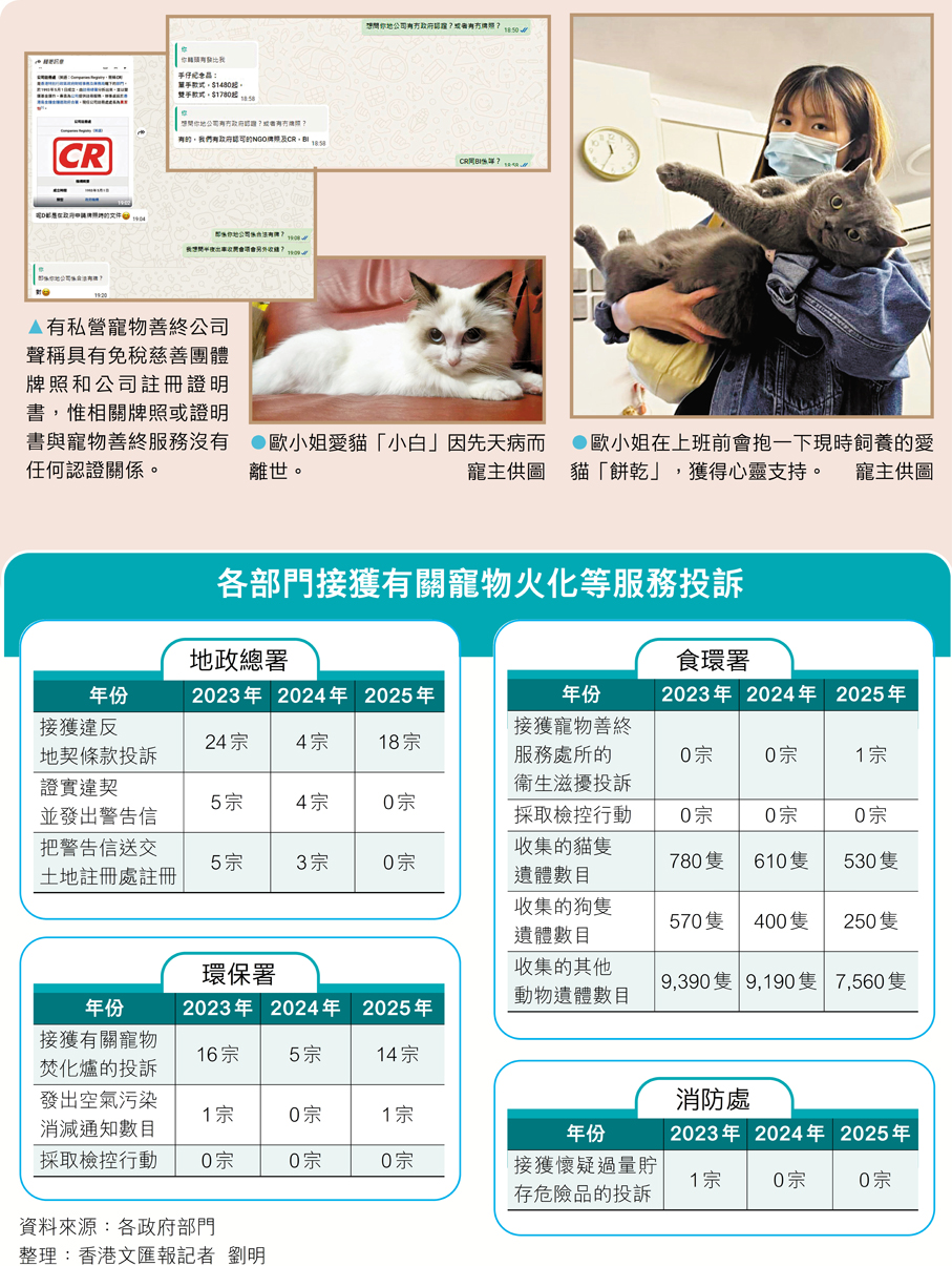 她坦言,以往並不知道寵物遺體會被歸為「都市固體廢物」,若交由食環署運往堆填區處理,相信對寵主而言是「二次傷害」,因為寵物對主人來說早已是家人般的存在。香港目前無合法公營寵物善終設施,私營機構不僅魚龍混雜,且沒有專門牌照監管,令她挑選服務時非常擔憂,既怕價格混亂、服務縮水,也擔心火化過程不透明、骨灰被掉包,「將愛寵交託外人處理一定會擔心,但都沒有辦法,只能依靠其他寵主的評價以判斷機構好壞。」