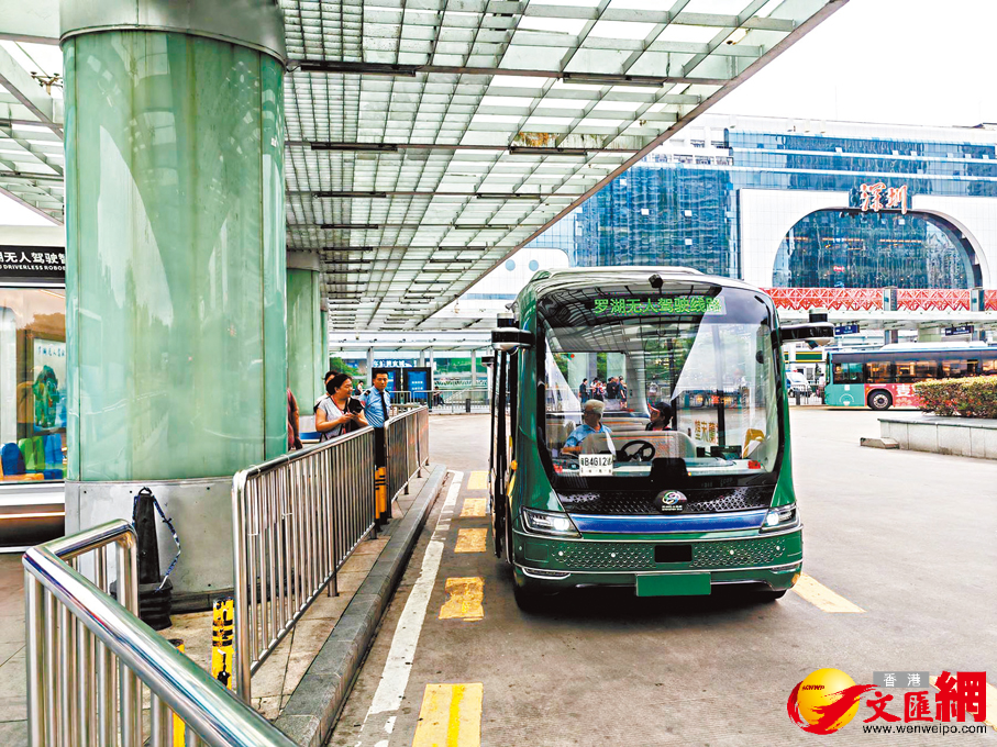在羅湖口岸旁公交站等候區域,一座專屬智慧候車亭格外引人注目。亭內配備智能互動展板和打卡服務,這正是深圳首條繁華中心城區L4級無人駕駛線路——B888線的起點。香港市民李先生過關後,立刻被這座充滿科技感的候車亭吸引。