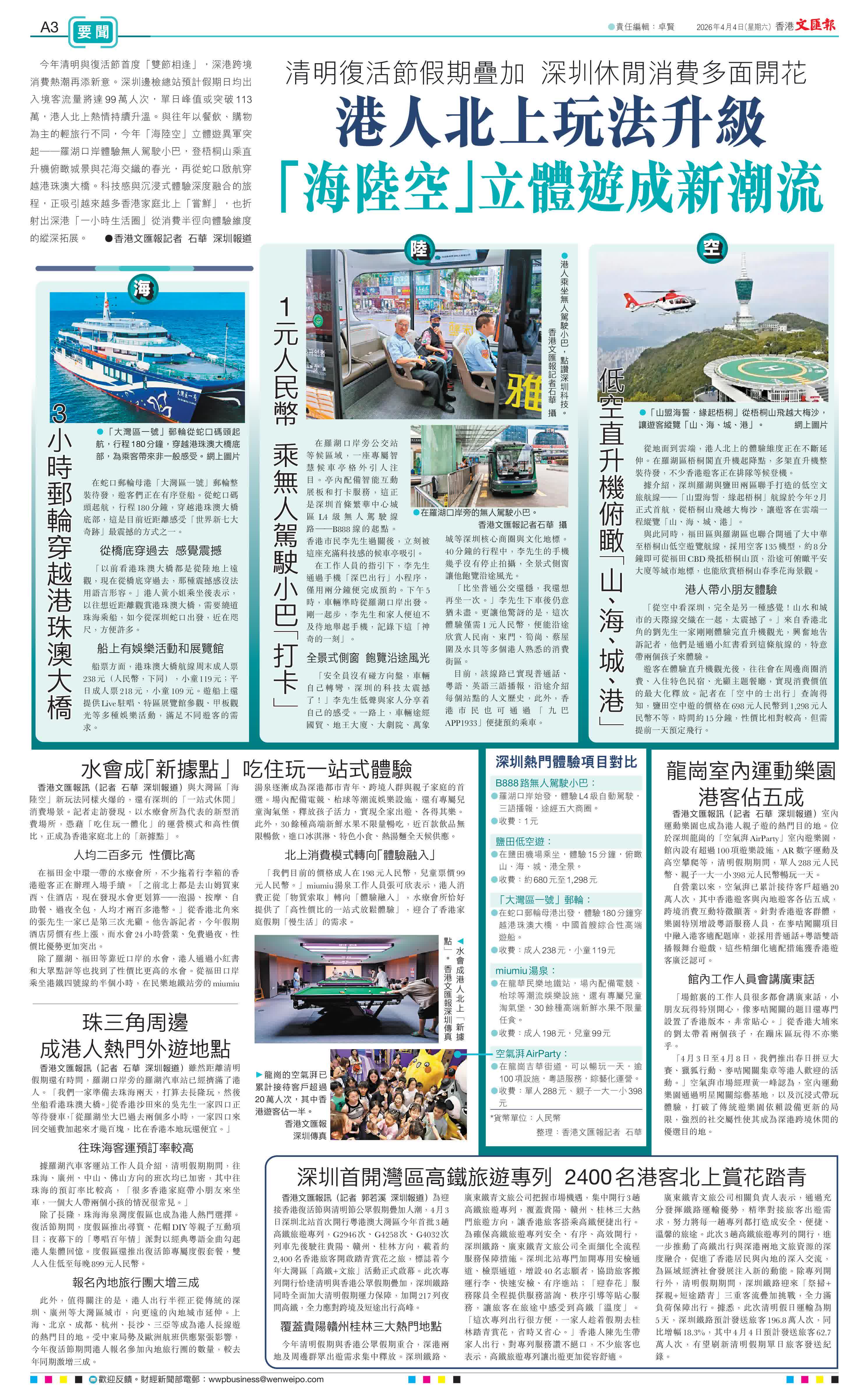 (香港文匯報記者 石華 深圳報道)今年清明與復活節首度「雙節相逢」,深港跨境消費熱潮再添新意。深圳邊檢總站預計假期日均出入境客流量將達99萬人次,單日峰值或突破113萬,港人北上熱情持續升溫。與往年以餐飲、購物為主的輕旅行不同,今年「海陸空」立體遊異軍突起──羅湖口岸體驗無人駕駛小巴,登梧桐山乘直升機俯瞰城景與花海交織的春光,再從蛇口啟航穿越港珠澳大橋。科技感與沉浸式體驗深度融合的旅程,正吸引越來越多香港家庭北上「嘗鮮」,也折射出深港「一小時生活圈」從消費半徑向體驗維度的縱深拓展。