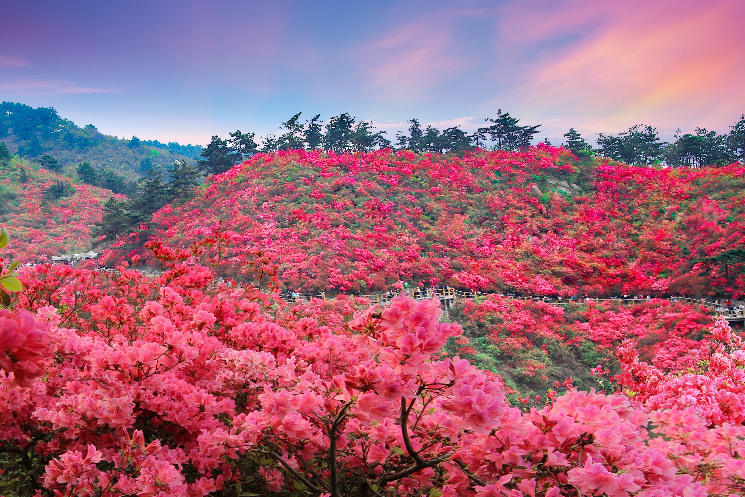 位於湖北省武漢市黃陂區的木蘭雲霧山景區,擁有武漢最大的高山杜鵑群落、華中地區規模最大的野生杜鵑群落,生長著映山紅、白鵑梅等7個品種的野生杜鵑,杜鵑品種多達400餘種,總面積超過萬畝。