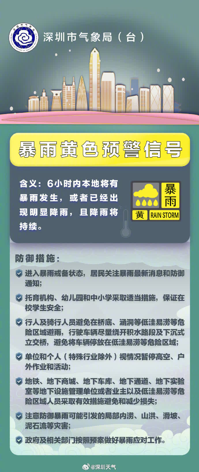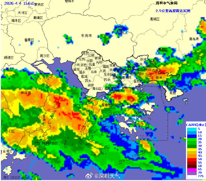 據深圳天地消息,受珠江口西側東移的雷雨雲團影響,預計深圳全市2—3小時內將出現30—50毫米降水,局地伴有7級左右短時大風,深圳市氣象台2026年4月4日11時02分將分區暴雨黃色預警信號擴展至全市,全市處於暴雨戒備狀態。請注意防禦暴雨可能引發的局部內澇、山洪等災害。