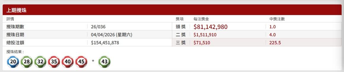 頭獎1注中,每注獎金$81,142,980;二獎4注中,每注獎金$1,511,910;三獎225.5注中,每注獎金$71,510。