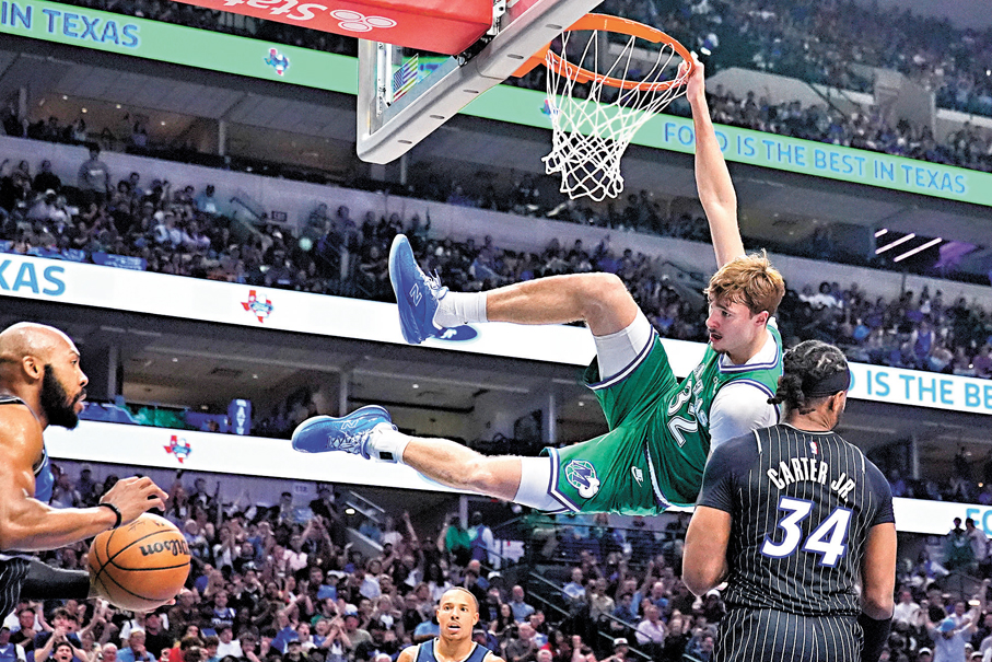效力獨行俠的狀元谷巴費治以一場足以載入史冊的「敗仗」,證明今季NBA「新人王」之爭尚未結束,獨行俠今場雖然主場以127:138不敵魔術,吞下主場14連敗,但費治以一場華麗的個人表演,讓全聯盟的目光再次聚焦在自己身上,今場轟入51分的他不僅刷新了個人單場得分紀錄,更以19歲又103天的年齡,成為NBA史上最年輕的單場「得分50+先生」,亦是向他大學時代隊友、效力黃蜂的新一代「三分王」干路柏發出最有力的挑戰書。 ●香港文匯報記者 郭正謙