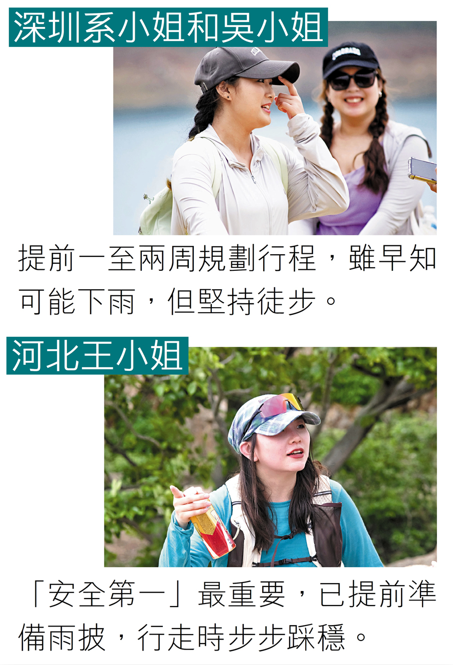 深圳旅客系小姐和吳小姐與友人組成4人小隊專程到場。她們表示平日上班壓力大,清明內地放三天假,趁機來港短途遊。清晨雨勢頗大,但她們選擇「雨中漫步」,認為這是新奇且自由的體驗。她們並表示提前一至兩周規劃行程,雖早知可能下雨,但秉持「來都來了」心態堅持徒步,並認為東壩風景不錯,但建議增加休息點與躲雨設施。