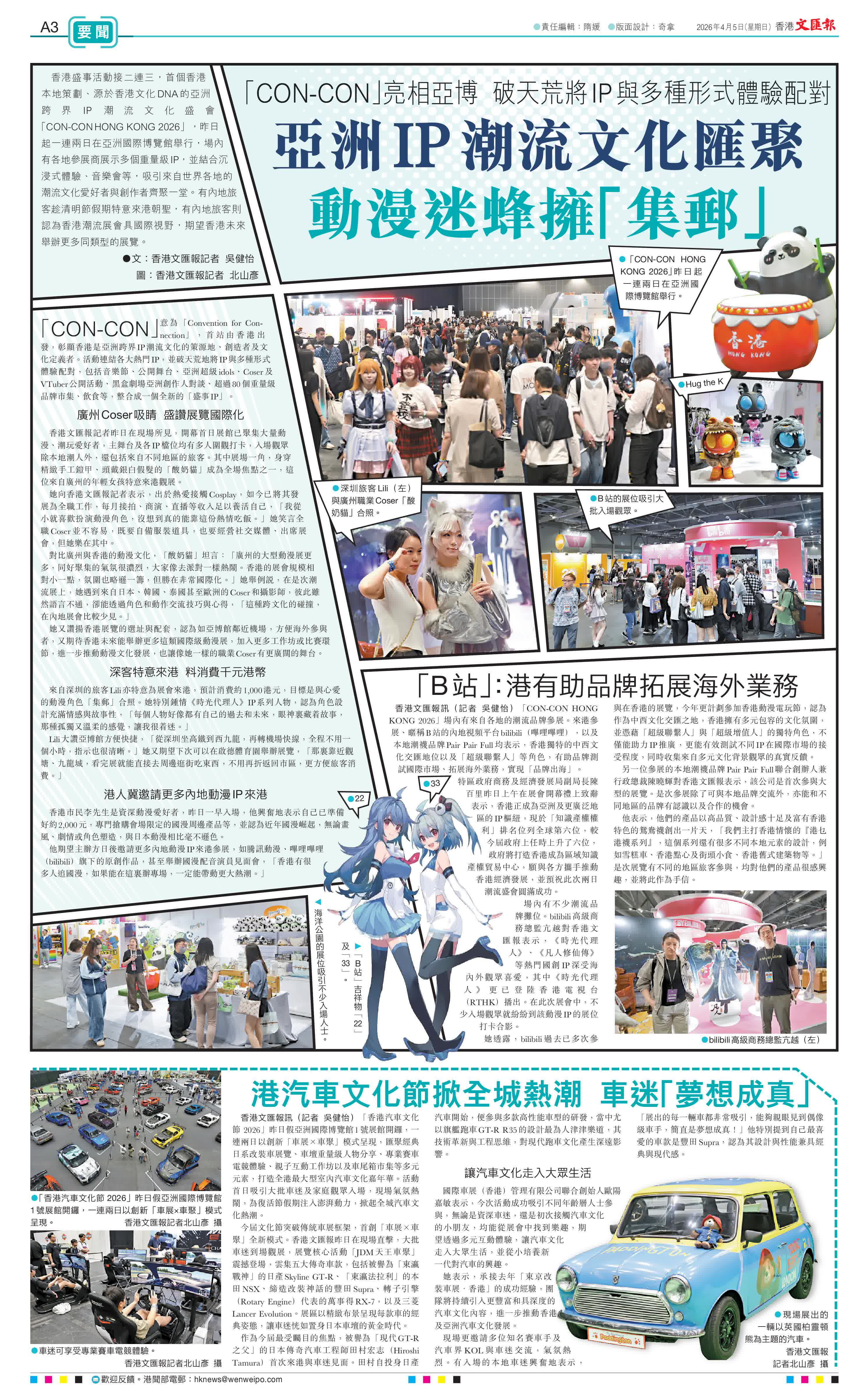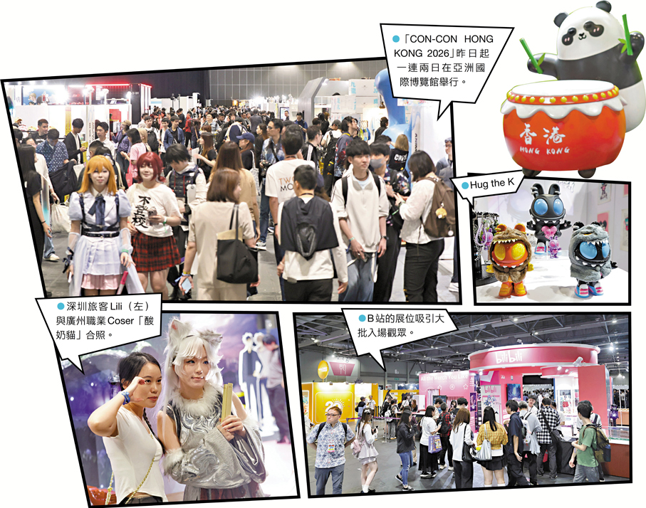 (文︰香港文匯報記者 吳健怡 圖︰香港文匯報記者 北山彥)香港盛事活動接二連三,首個香港本地策劃、源於香港文化DNA的亞洲跨界IP潮流文化盛會「CON-CON HONG KONG 2026」,昨日起一連兩日在亞洲國際博覽館舉行,場內有各地參展商展示多個重量級IP,並結合沉浸式體驗、音樂會等,吸引來自世界各地的潮流文化愛好者與創作者齊聚一堂。有內地旅客趁清明節假期特意來港朝聖,有內地旅客則認為香港潮流展會具國際視野,期望香港未來舉辦更多同類型的展覽。