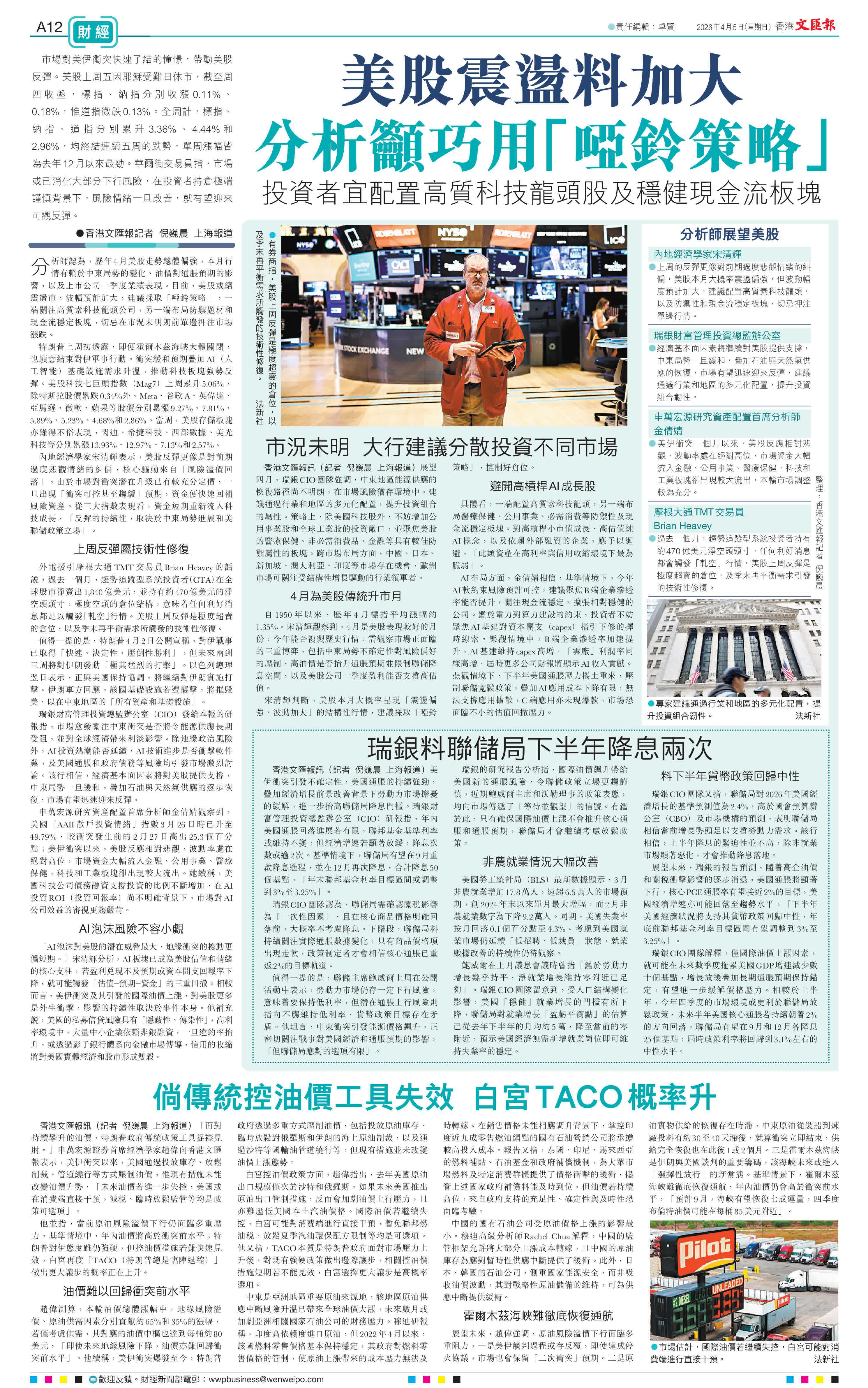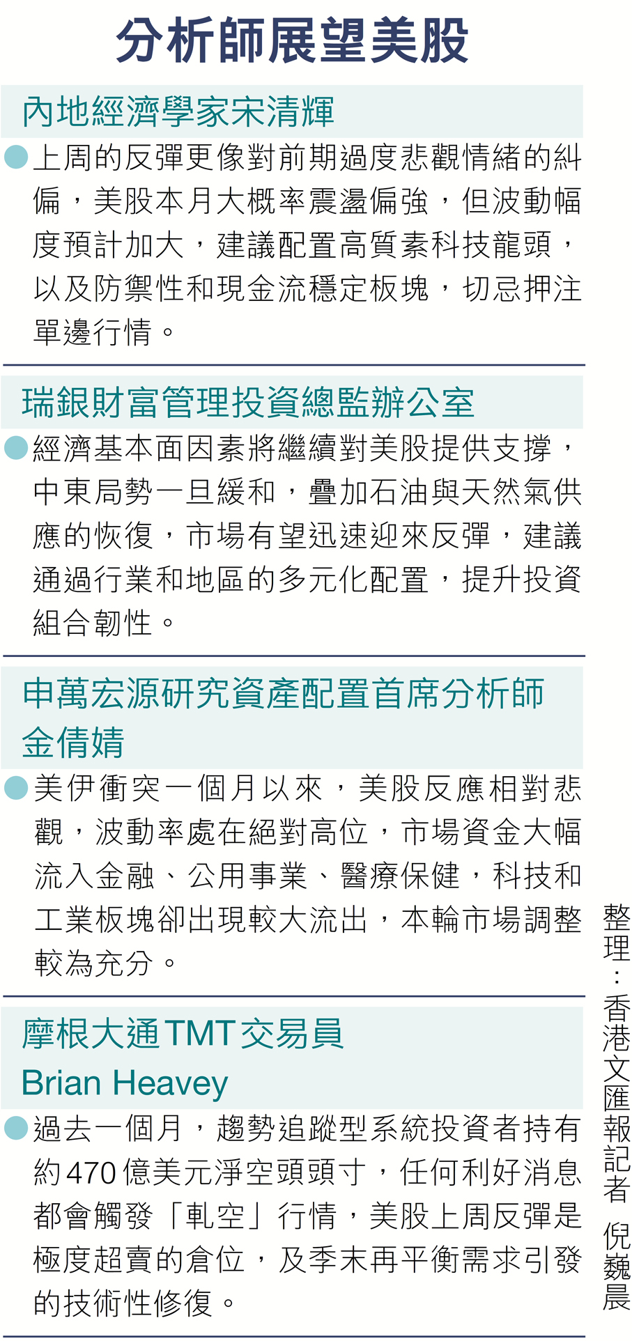 分析師認為,歷年4月美股走勢總體偏強,本月行情有賴於中東局勢的變化、油價對通脹預期的影響,以及上市公司一季度業績表現。目前,美股或續震盪市,波幅預計加大,建議採取「啞鈴策略」,一端關注高質素科技龍頭公司,另一端布局防禦題材和現金流穩定板塊,切忌在市況未明朗前單邊押注市場漲跌。