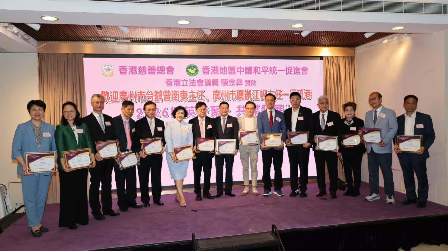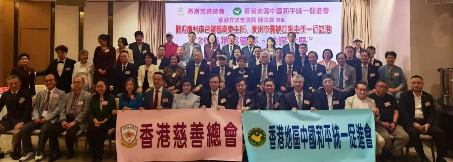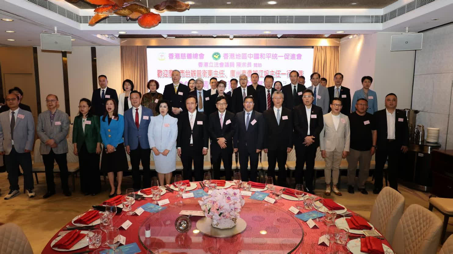 晚上六點,晚宴正式開始。大會主席、香港立法會議員、美麗華集團首席營運總裁陳宗彝先生,聯同香港慈善總會主席、香港地區中國和平統一促進會主席鄭蘇薇M·H,一同恭迎出席的主禮嘉賓:香港特區政府勞工及福利局局長孫玉菡JP;中央政府駐港聯絡辦協調部副部長陳澤濤先生;全國政協常委、中國和平統一促進會香港總會會長姚志勝GBS,JP;港區全國人大代表、香港立法會議員陳曼琪M·H,JP;全國政協委員、大灣區金融科技促進總會會長莊紫祥JP;香港慈善總會榮譽主席、香港寶聲集團董事長陳燿璋先生;專程從內地趕來的廣州市台辦主任曾衛東先生和番禺區台辦主任陳敏堅、從化區台辦主任黃潤杭、增城區台辦主任陳笑弟等,廣州市委統戰部副部長江帆和荔灣區統戰部副部長陳志純;以及全球商會會長戰略合作協會主席李農合先生、來自江西革命老區的江西師範大學蘇區振興研究院院長劉善慶和高級研究員陳傑等。