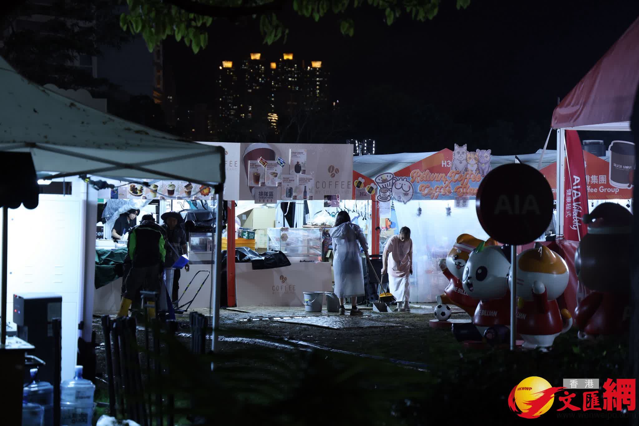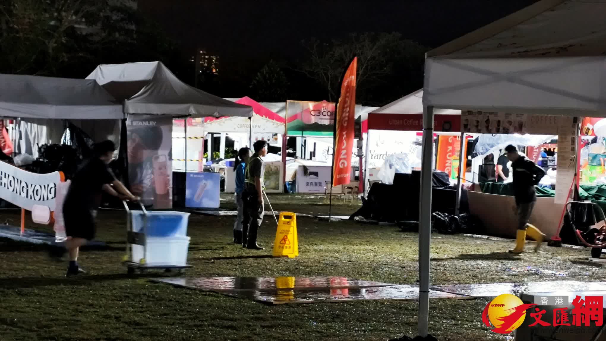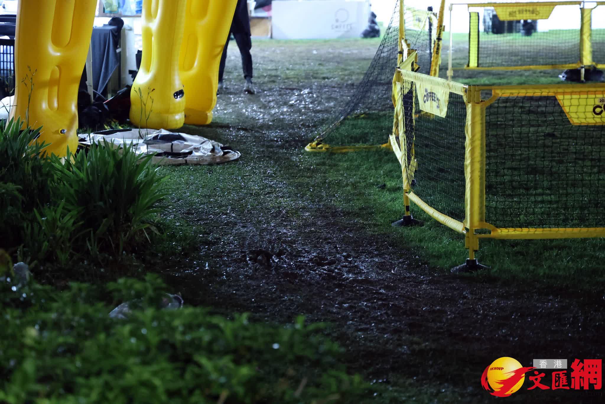 受天雨影響,西九藝術公園的草地今日變成一片泥濘和有積水,有參加者需用膠袋包裹雙腳入場。主辦方解釋,雨勢超乎預期,天文台連續兩日發出黃色暴雨警告,持續大雨導致大草坪出現積水,主辦單位已抽調吸水設備持續清理,並感謝參加者及檔主的體諒與支持。