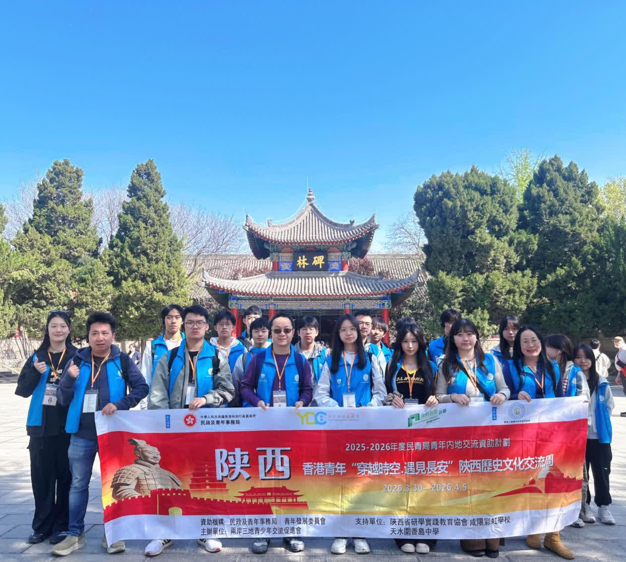 2026年3月30日至4月5日,由「兩岸三地青少年交流促進會」主辦、香港民政及青年事務局與青年發展委員會合辦並資助的2025—2026年度「香港民青局青年內地交流資助計劃」之「穿越時空・遇見長安」陝西歷史文化交流周圓滿落幕。來自香港20餘名師生跨越千裏走進陝西,以沉浸式研學觸摸千年文脈,在歷史與科技交融中厚植家國情懷,圓滿完成為期七日的文化探索之旅。