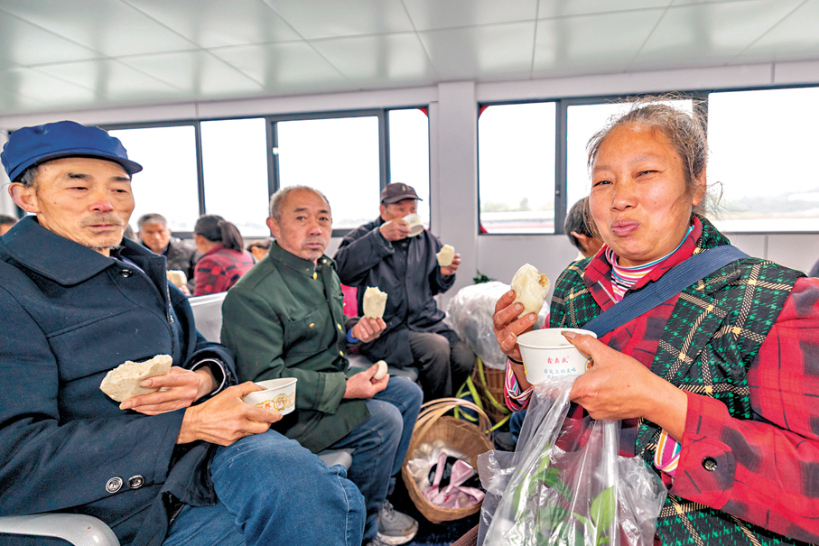 「以前老船四面透風,冬天冷得直哆嗦,現在好了。」76歲的李興德挑着竹籠去縣城趕集,在新船上舒服地靠着椅背。他說,這班船開了十幾年,他也坐了十幾年,「要是這船不開了,我們可能就不再出門了。」