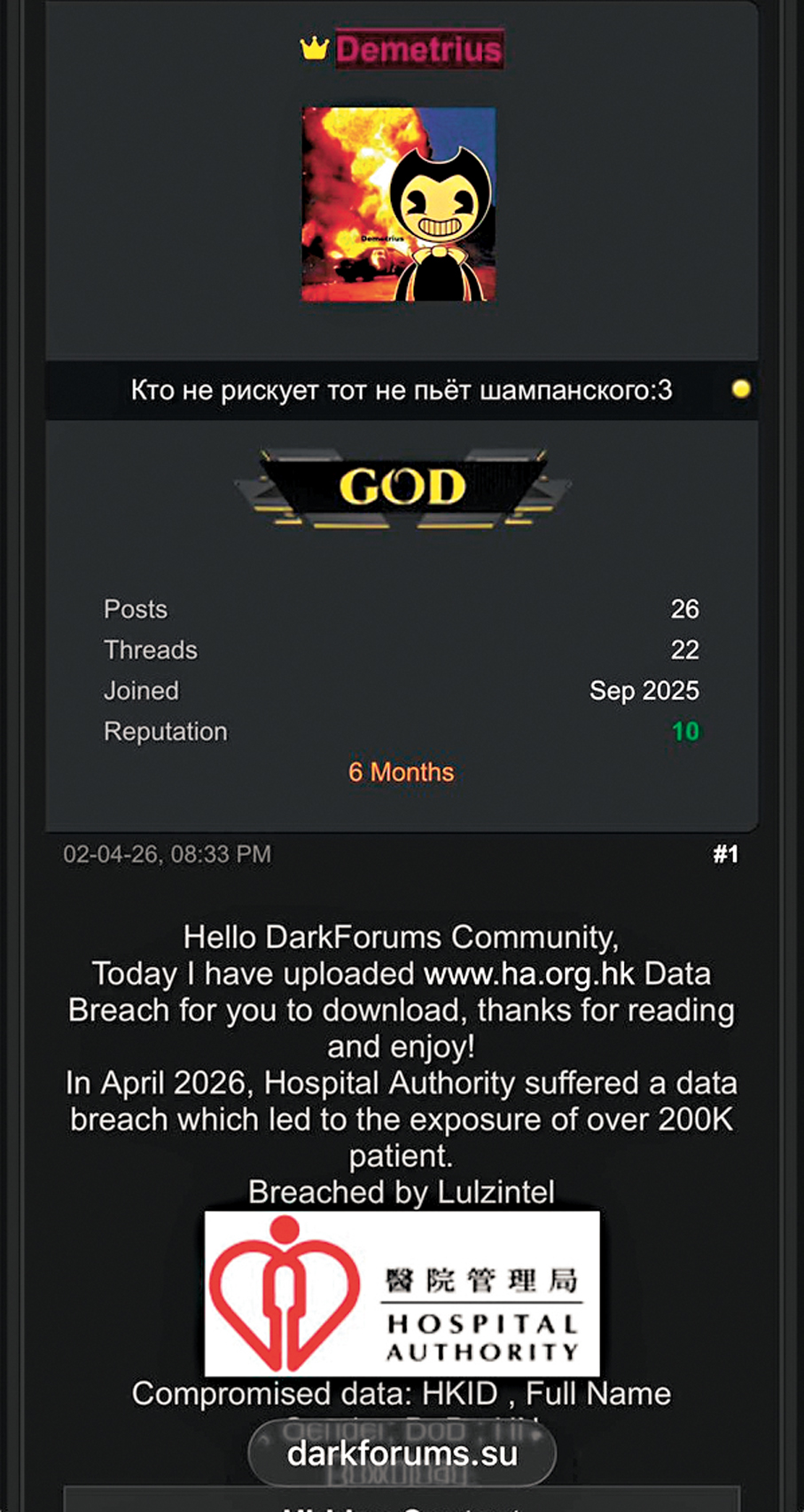 該名熟悉網絡安全的網民指出,Demetrius上周四(2日)以個人名義在暗網發出帖文,指手上有一份載有逾20萬則病歷的香港醫管局資料可供免費下載。據悉,這次已非Demetrius第一次「公諸同好」,他向來以高超的黑客技術及愛炫耀能力聞名,過去曾多次在暗網上公開機密資料。