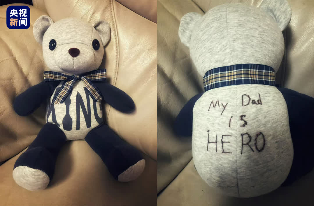 輔警的妻子寄來的這件灰色衛衣,是丈夫生前最愛穿的便裝。喻潔想,這個孩子對爸爸的最初印象,或許就來自這隻小熊。縫製過程中,喻潔幾度落淚。為了讓這隻小熊更特別,她特意在熊身上縫了一句話:My dad is hero(我的爸爸是英雄)。
