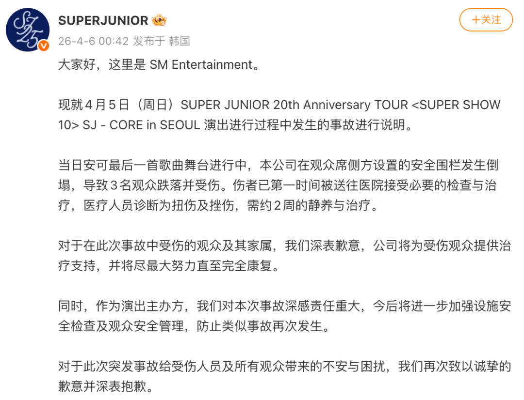 同時,作為演出主辦方,我們對本次事故深感責任重大,今後將進一步加強設施安全檢查及觀眾安全管理,防止類似事故再次發生。