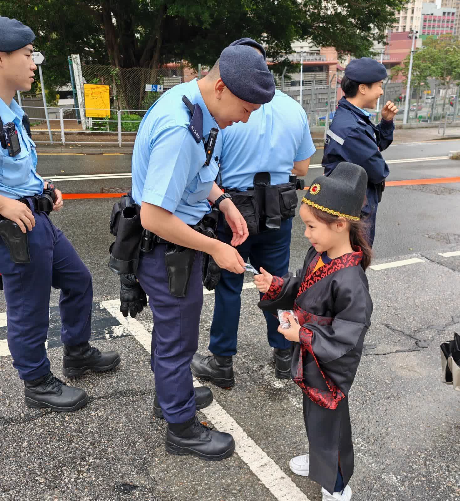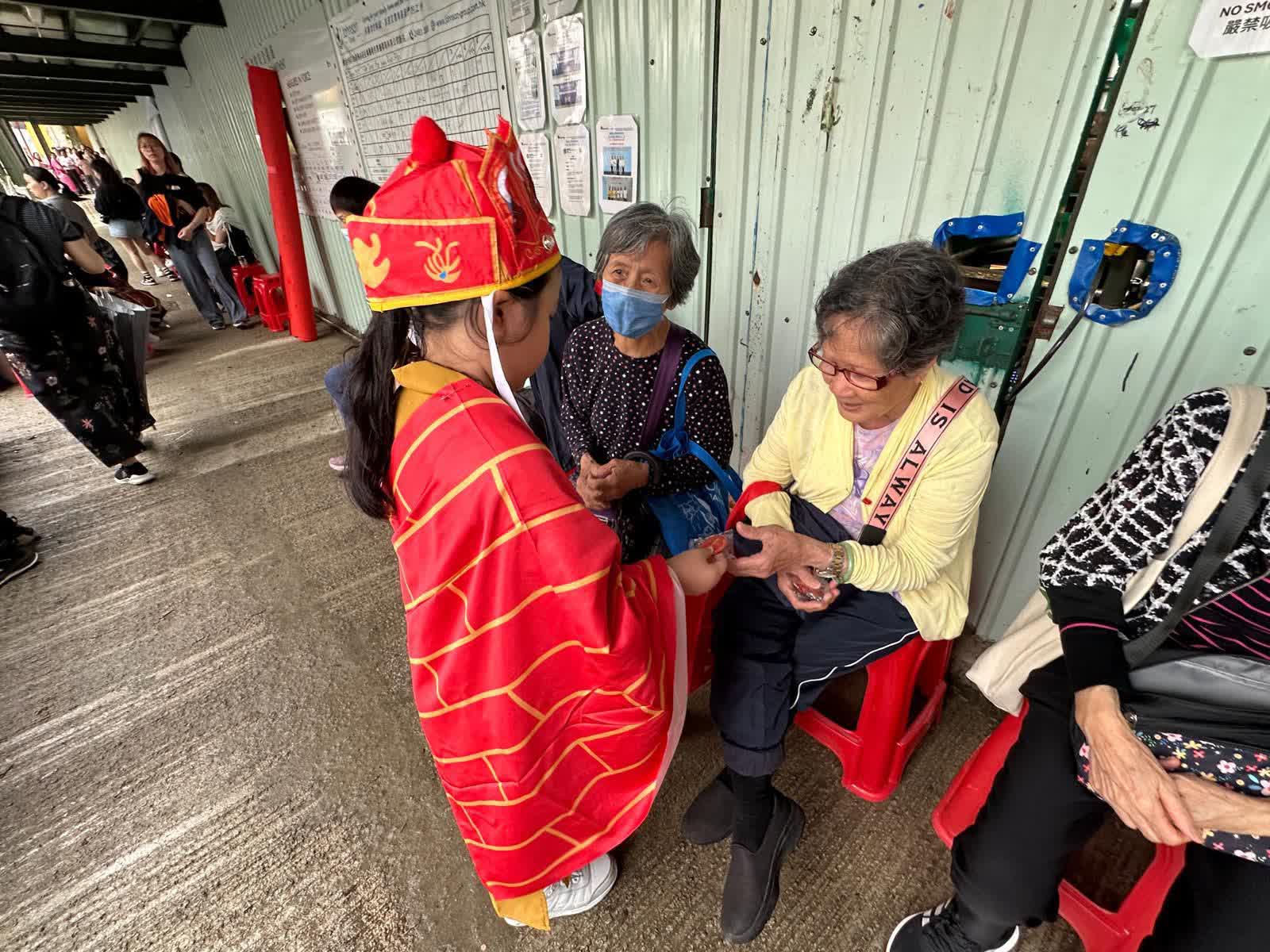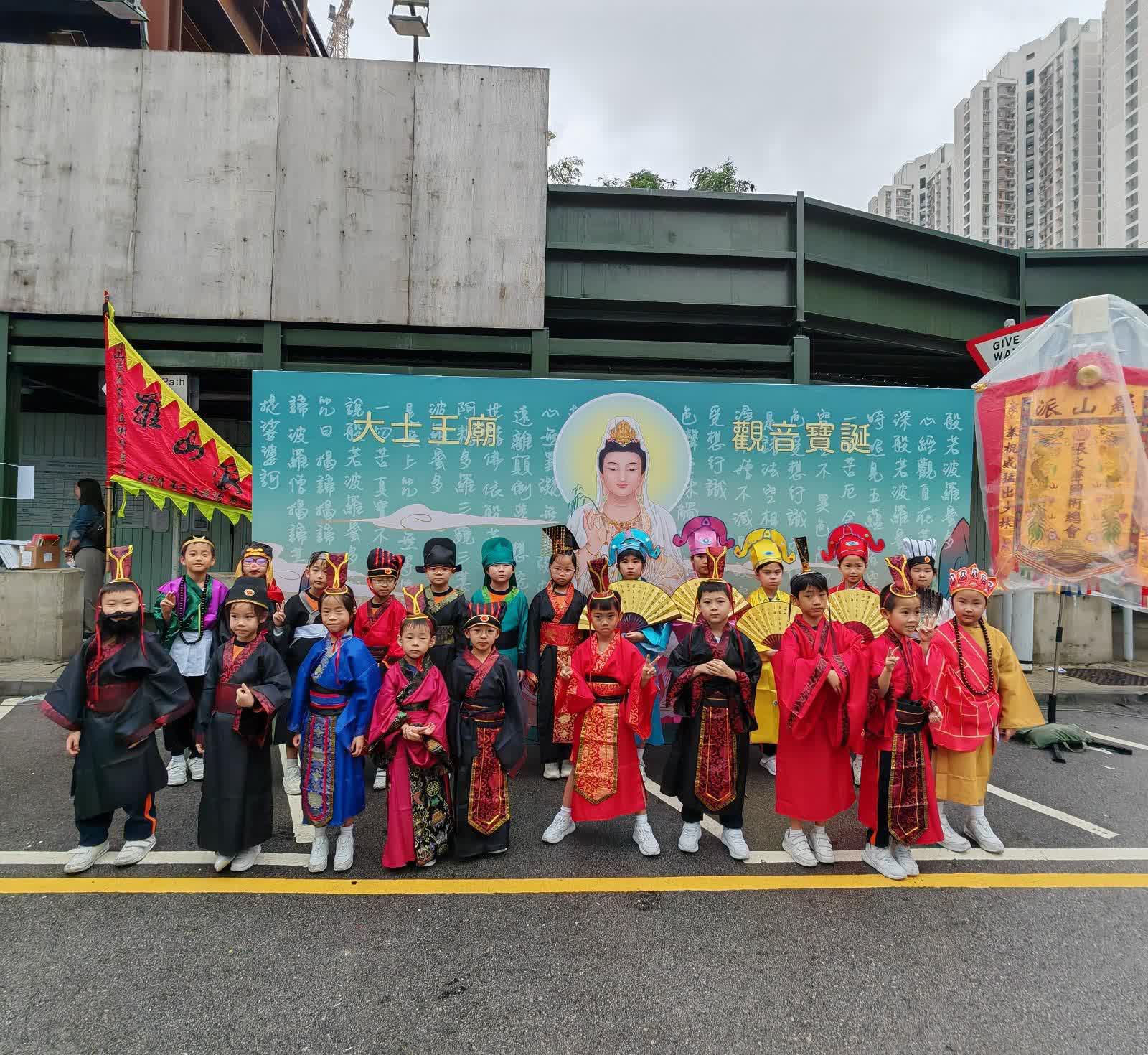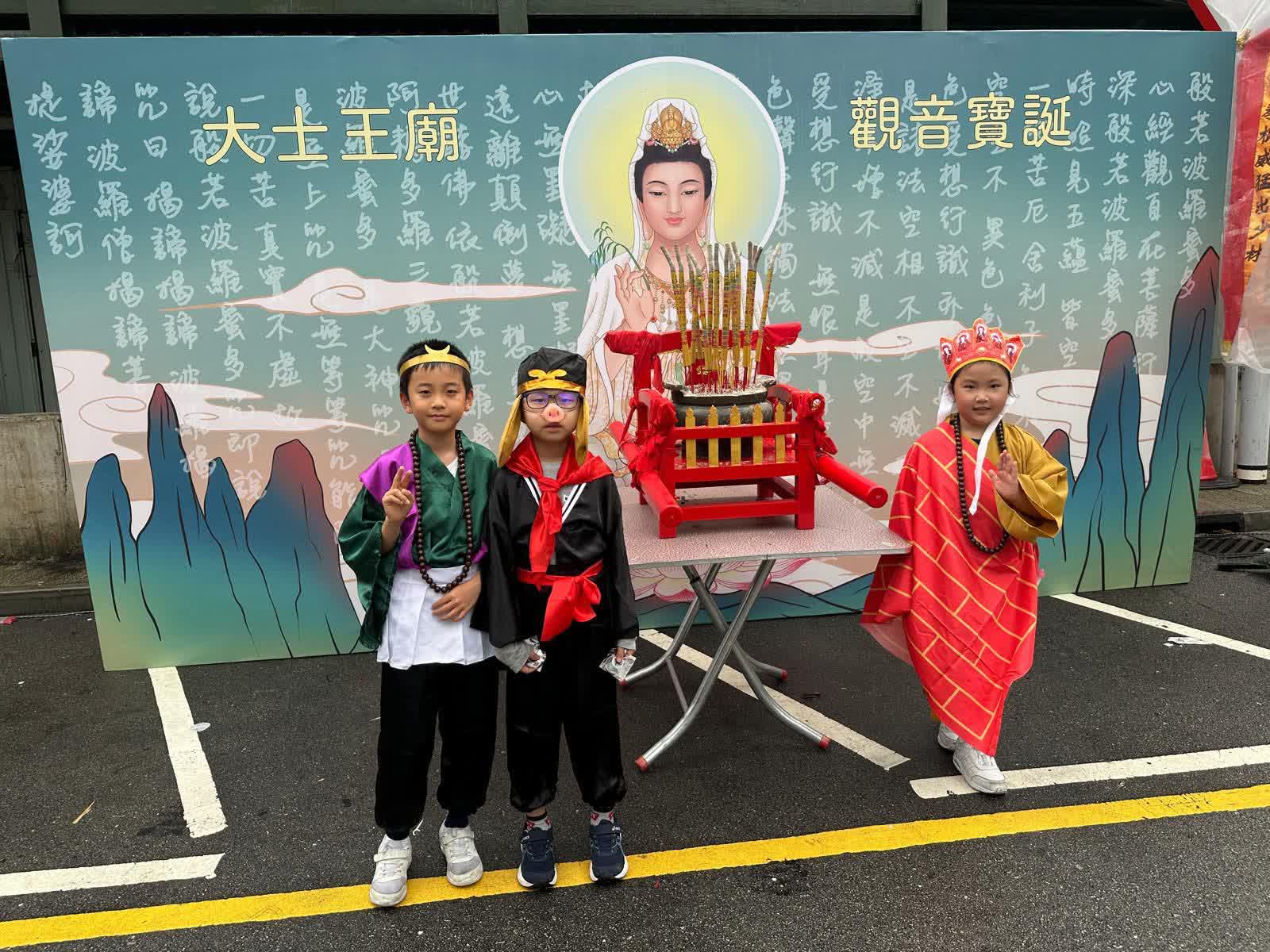 適逢今日(6日)觀音寶誕慶典,陳呂重德紀念學校學生走進社區,化身學生義工參與油塘大士王廟的現場服務,身體力行傳遞善意。約30名學生穿上大會提供的傳統服飾,扮演「梁山好漢」主題角色,主動向市民派發禮品,並與街坊合照留念,投入之餘更展現十足朝氣,體現「小小志工」的服務精神與團隊合作。