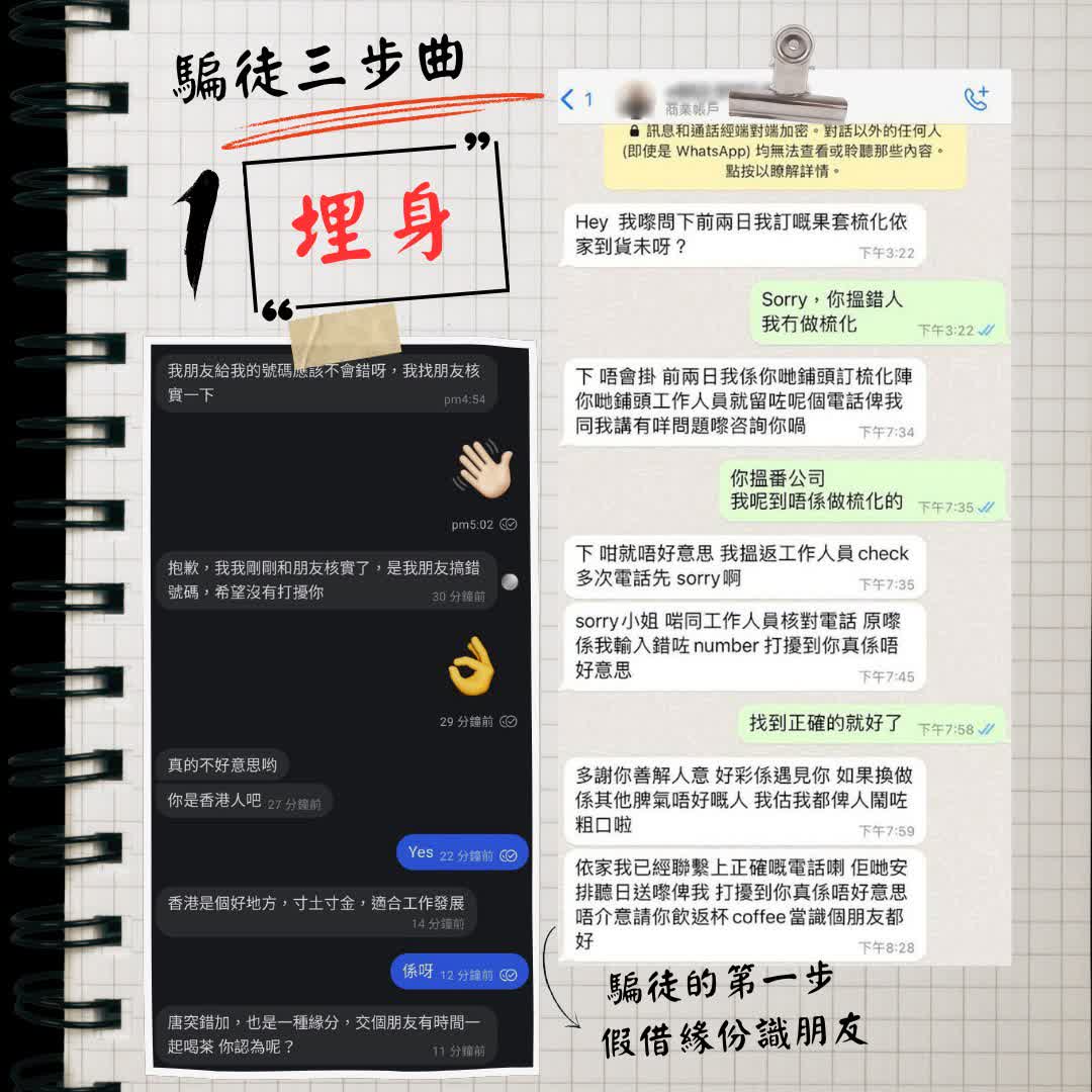 騙徒經常透過WhatsApp、WeChat以及Facebook 等平台向受害人「埋身」,藉口層出不窮,有扮鄰居問你屋企是否漏水,又稱聽到你屋企夜晚十分嘈吵,扮送貨通知等等。但無論你的答案如何,他們的目的只是想和你「交朋友」,然後再分享投資心得。