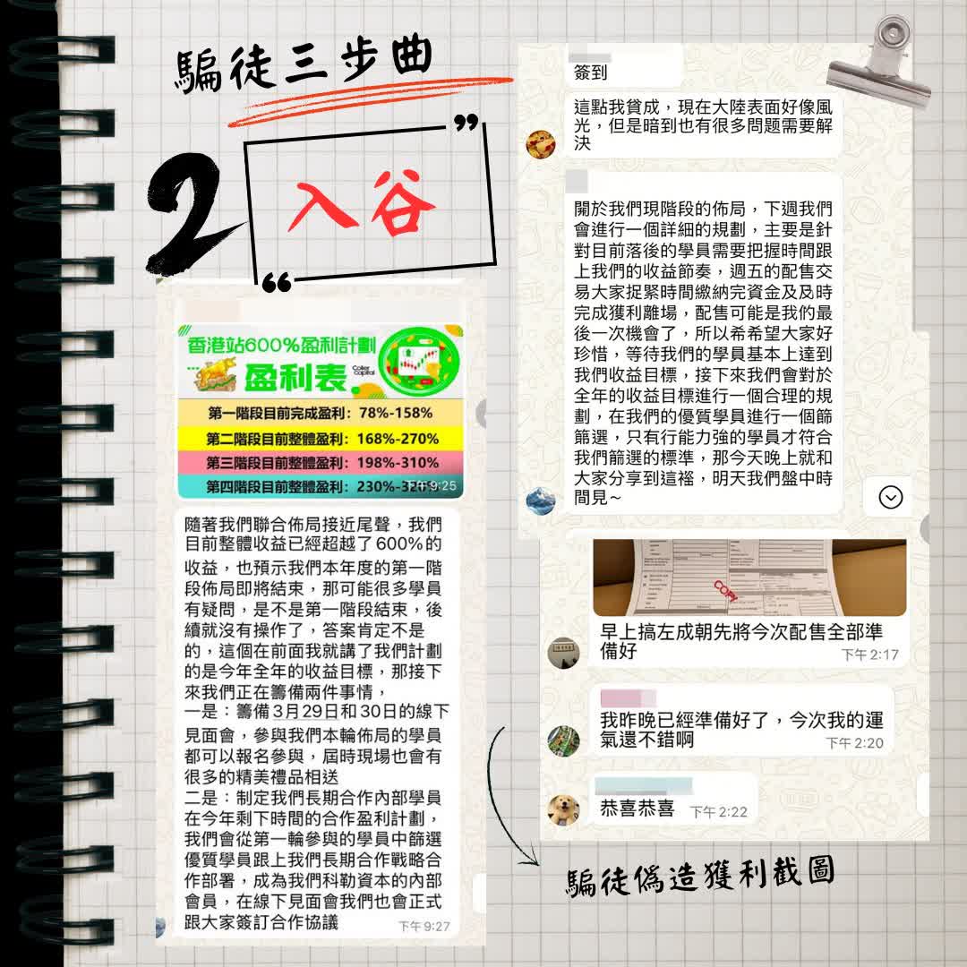 其後把你當成是自己人,介紹你入投資群組,有A.I替你分析投資策略,還有「專家」和你分享內幕消息,其他谷友在群組不時分享獲利截圖,誘你入局。