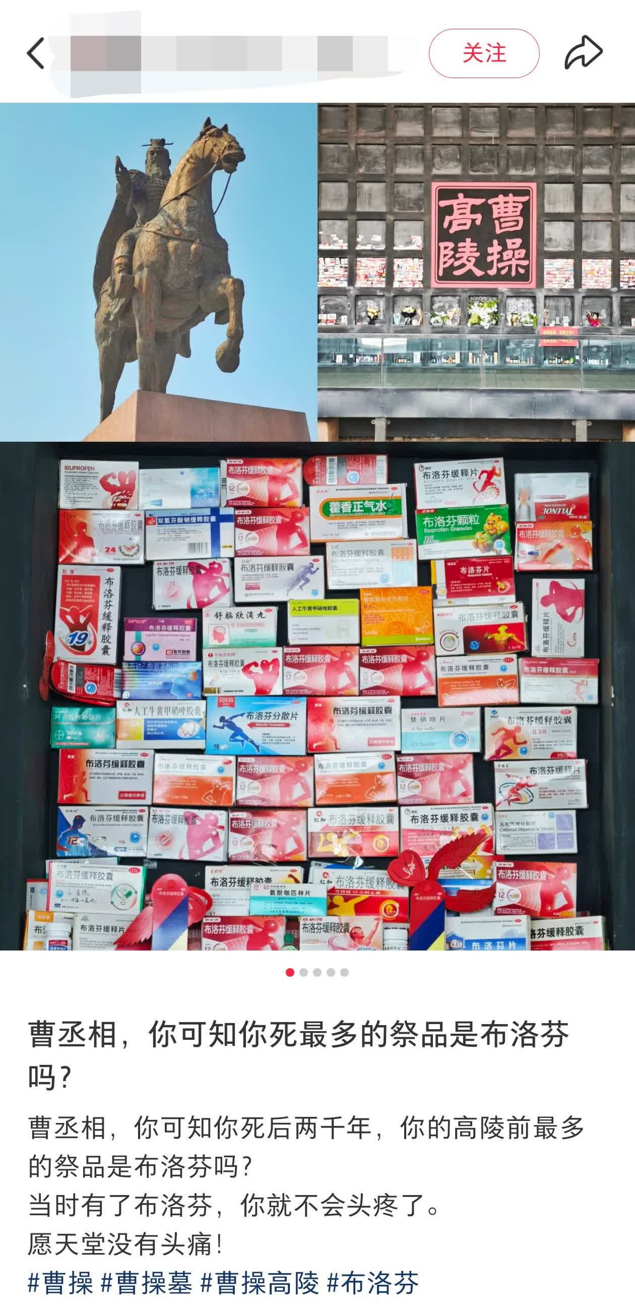 記者在社交平台看到,不少網友曬出的照片和視頻中,曹操墓前的供品櫃裏,布洛芬琳琅滿目,既有常見的片劑,也有緩釋膠囊,旁邊還散落着青梅酒、三國殺卡牌、「大魏錦旗」等物件。有網友配文感慨,「讀史時總為曹丞相的偏頭痛惋惜,如今送盒布洛芬,也算圓了一份跨越千年的牽掛」;評論區裏,更有網友玩起歷史梗,「因青梅煮酒論英雄送青梅酒,因一生征戰送三國殺,年輕人的浪漫,藏在對歷史的細節裏」。