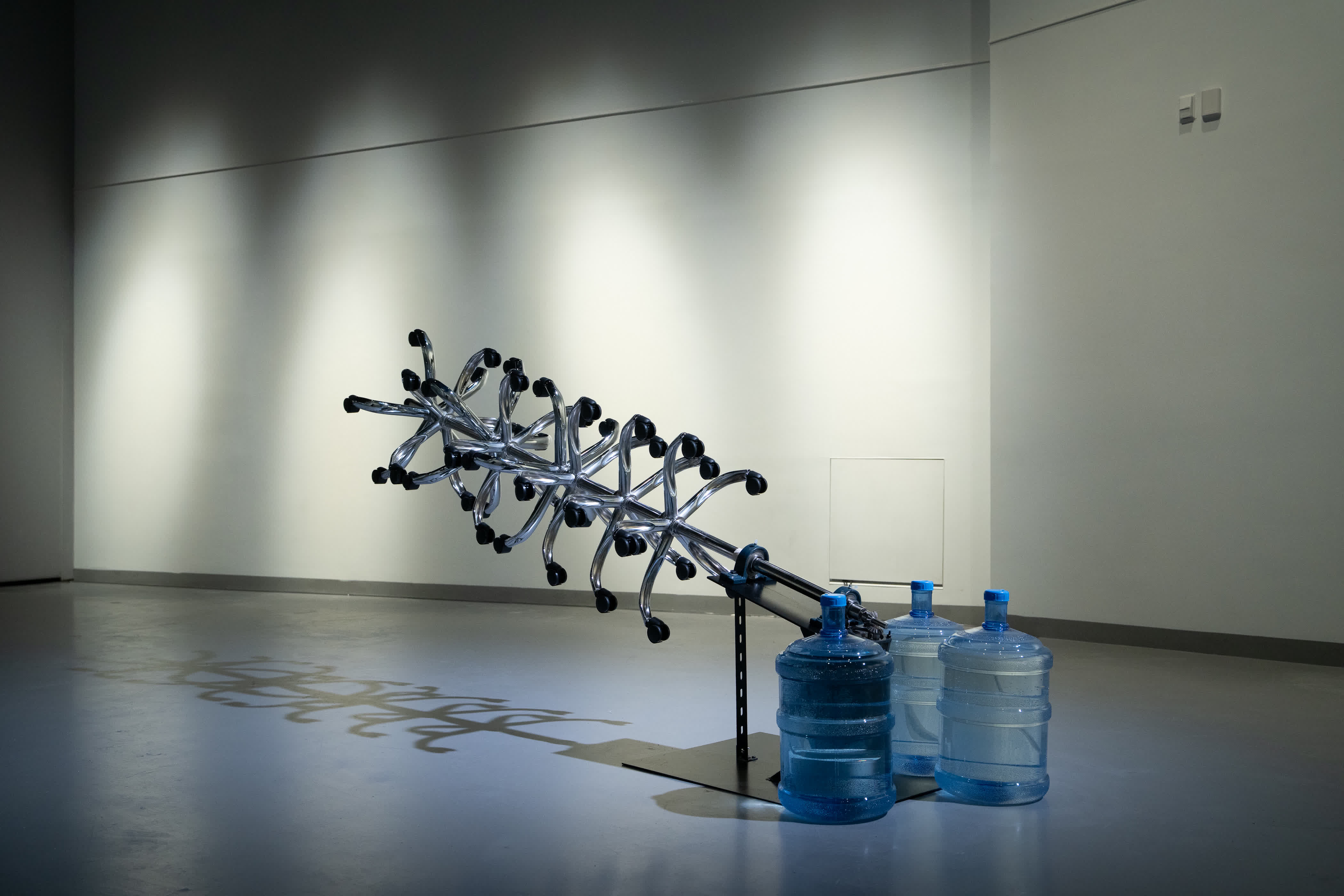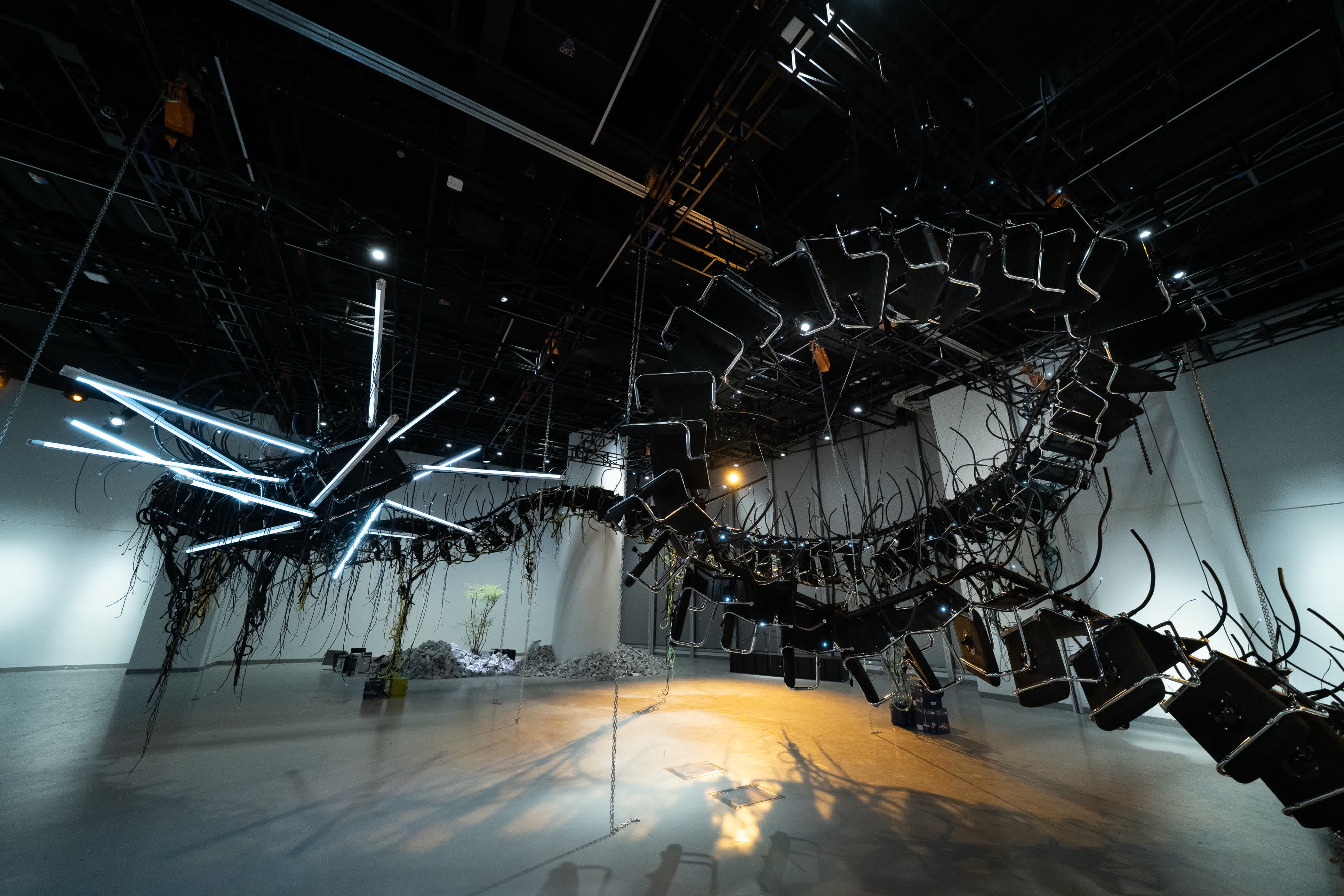 • 《我們小心養大的獸》——懸吊於空中的巨型動態雕塑,由辦公椅組成的「機械脊骨」呼吸般律動。