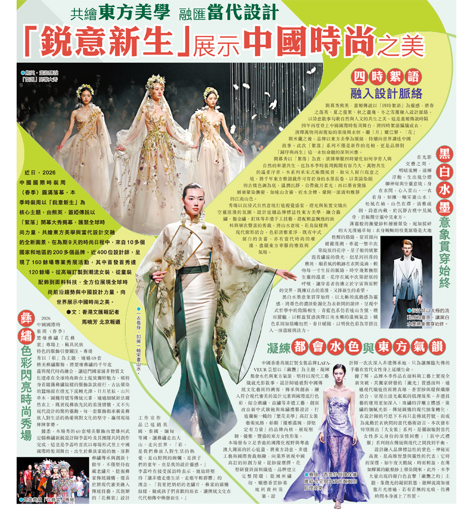 近日,2026中國國際時裝周(春季)圓滿落幕。本季時裝周以「銳意新生」為核心主題,由熊英·蓋婭傳說以「絮落」開幕大秀揭幕,匯聚全球時尚力量,共繪東方美學與當代設計交融的全新圖景。在為期9天的時尚日程中,來自10多個國家和地區的200多個品牌、近400位設計師,呈現了160餘場專業秀展活動,其中首發首秀達120餘場。從高端訂製到潮流女裝,從童裝配飾到面料科技,全方位展現全球時尚前沿趨勢與中國設計力量,向世界展示中國時尚之美。