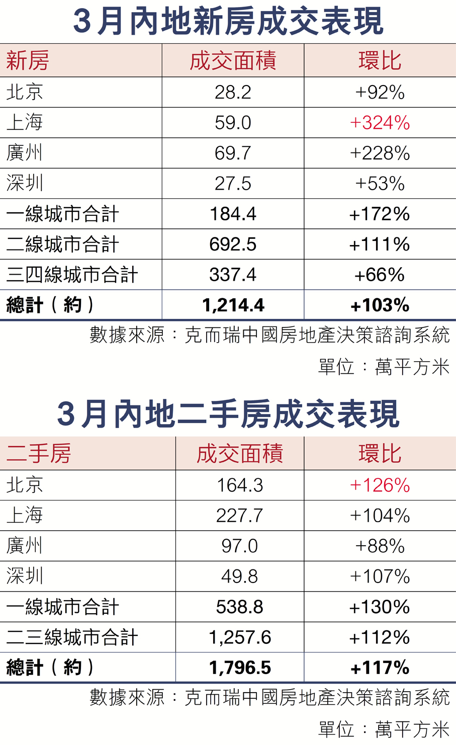 上海歷來是內地樓市風向標,在樓市持續調整多年後,上海於今年2月底發布放鬆樓市限購的新政策(即「滬七條」),大幅放寬非上海戶籍購房者限購措施,此前受到壓制的剛需及改善型購房需求得到釋放,帶動樓市升溫。據上海房產交易中心官網「網上房地產」數據,3月份,上海二手房(含商業)累計網簽31,215套,一舉刷新自2021年3月以來近5年的最高紀錄,同比增長6.39%。更值得關注的是價格,中指研究院披露,上海3月二手住宅均價環比微增0.08%,結束了此前連續33個月的下跌態勢。新房方面,上海中原地產數據顯示,3月上海新建商品住宅成交面積56.3萬平方米,環比激增251.6%,反彈力度空前。