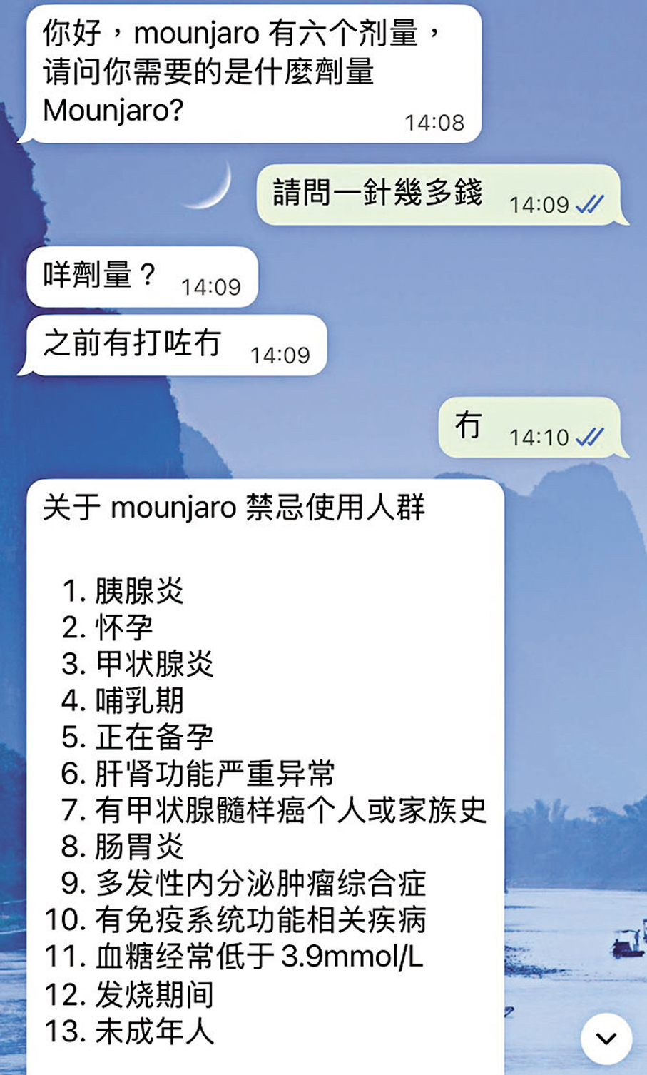 記者到網上查找門路,在社交平台搜尋「香港瘦瘦筆」,找到3個聲稱能銷售「滿健樂」(Mounjaro)的賣家,並順利與其中一人聯絡。對方開場先詢問記者有否打過Mounjaro,得知記者是「減肥針新手」後,遂以簡體字發來預先備好的「Mounjaro禁忌使用人群」訊息,提及「有胰腺炎、甲狀腺炎、懷孕和正在備孕、未成年等人群禁忌使用」,還特別附註一句「(使用者)購買和使用前,需確保自身處於健康狀態」作「免責聲明」。