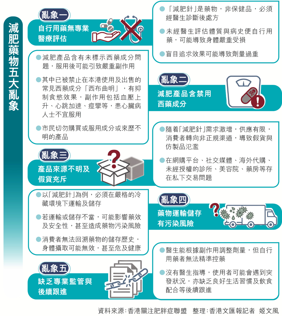 香港關注肥胖症聯盟昨日舉行記者會,揭示本港目前存在五大減肥亂象(見另稿),當中包括「減肥針」問題,發現有消費者轉向非正規渠道購買,並且假貨與仿製品氾濫,藥物成效及安全成疑。香港代謝及減重外科醫學會主席黃健鴻特別提醒,網上有些人分享所謂用藥減肥經歷,「例如去日本旅行,聲稱可以取6個月藥回來,告訴別人可以如何減肥,亦有人教『由幾多度開始打(針)』、『打幾多針』、『如何調校』等等,但在字裏行間其實你會見到,對方連針都不懂如何用,如此跟別人講一些不知正確與否的『醫療常識』,其實很容易會誤導市民。」