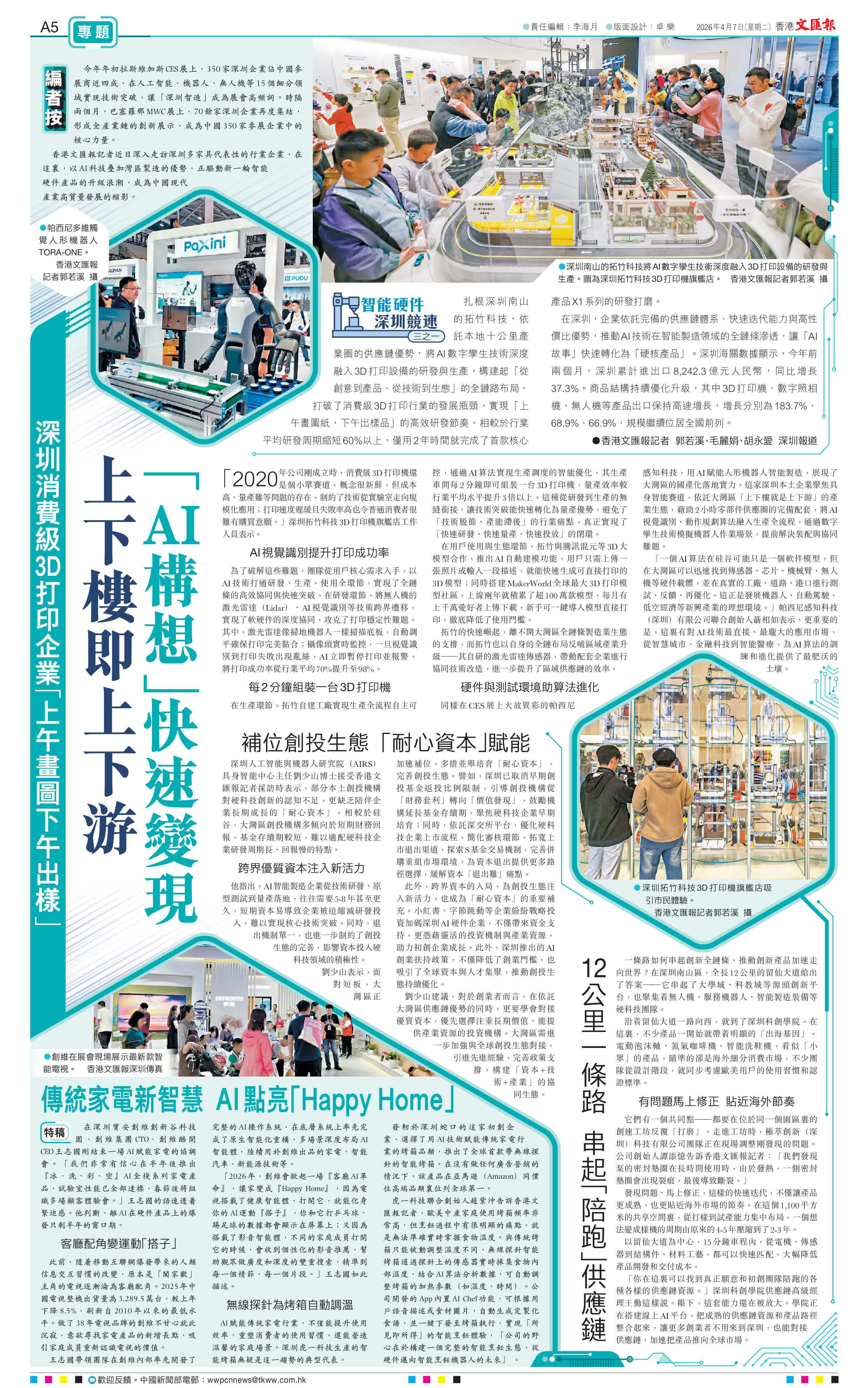 在深圳,企業依託完備的供應鏈體系、快速迭代能力與高性價比優勢,推動AI技術在智能製造領域的全鏈條滲透,讓「AI故事」快速轉化為「硬核產品」。深圳海關數據顯示,今年前兩個月,深圳累計進出口8,242.3億元人民幣,同比增長37.3%。商品結構持續優化升級,其中3D打印機、數字照相機、無人機等產品出口保持高速增長,增長分別為183.7%、68.9%、66.9%,規模繼續位居全國前列。●香港文匯報記者 郭若溪、毛麗娟、胡永愛 深圳報道