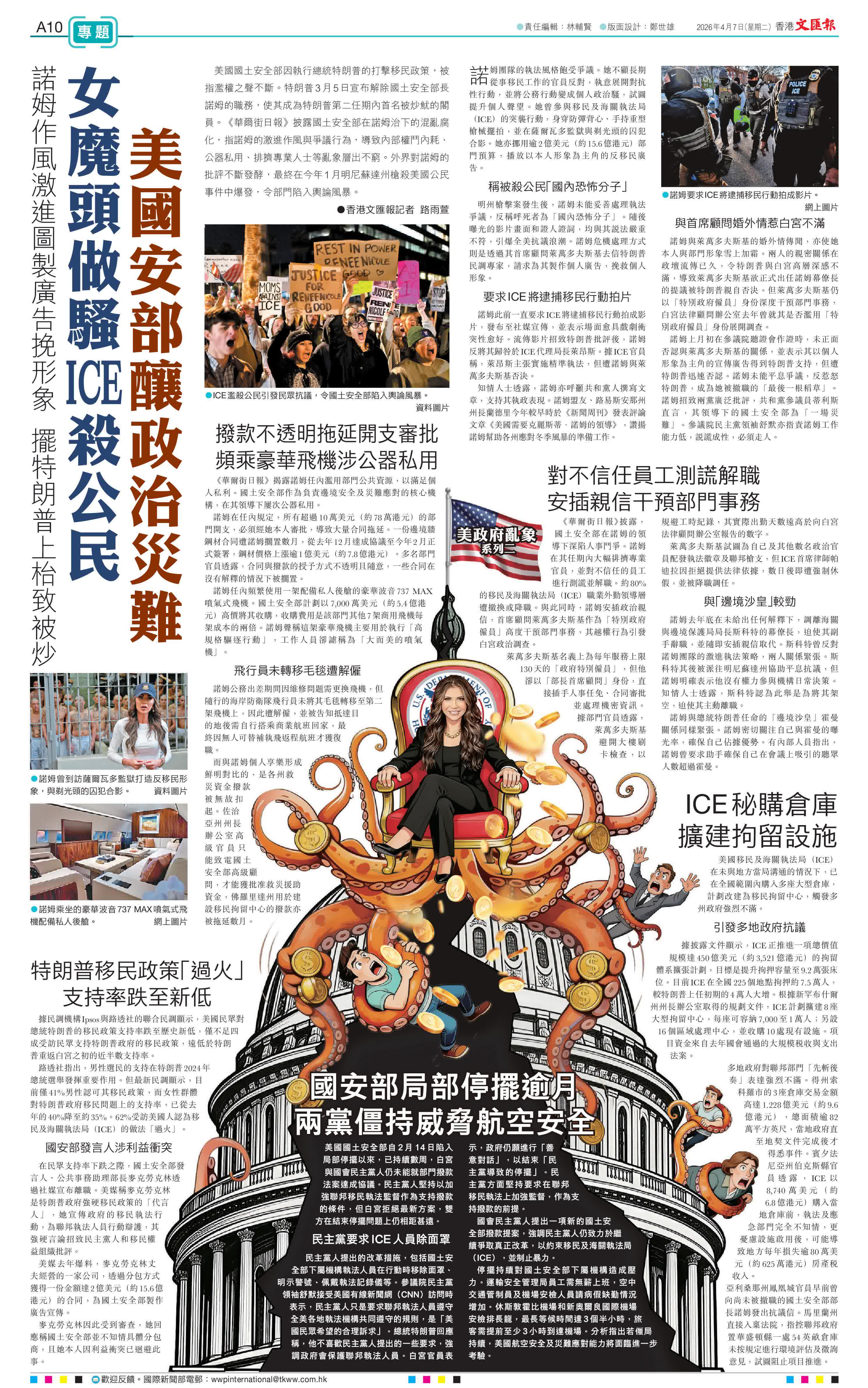 香港文匯報訊(記者 路雨萱)美國國土安全部因執行總統特朗普的打擊移民政策,被指濫權之聲不斷。特朗普3月5日宣布解除國土安全部長諾姆的職務,使其成為特朗普第二任期內首名被炒魷的閣員。《華爾街日報》披露國土安全部在諾姆治下的混亂腐化,指諾姆的激進作風與爭議行為,導致內部權鬥內耗、公器私用、排擠專業人士等亂象層出不窮。外界對諾姆的批評不斷發酵,最終在今年1月明尼蘇達州槍殺美國公民事件中爆發,令部門陷入輿論風暴。