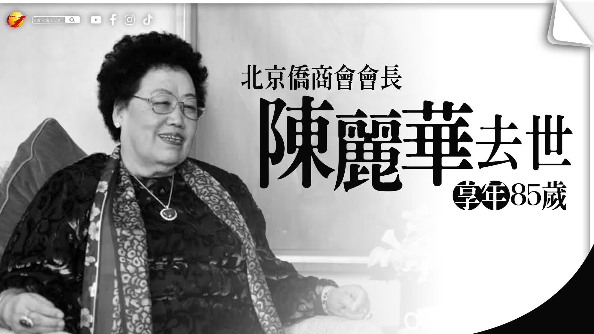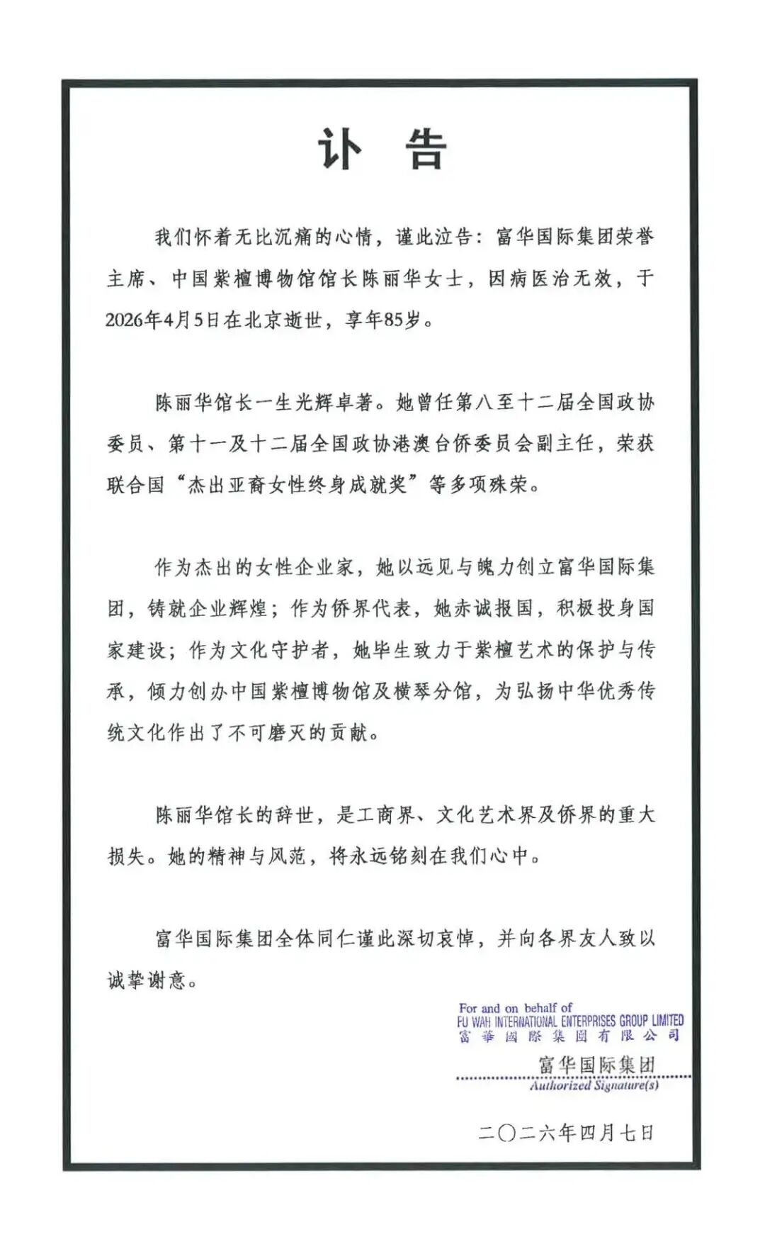 4月7日,北京僑商會發布訃告稱,該會會長、富華國際集團榮譽主席、中國紫檀博物館館長陳麗華女士,因病醫治無效,於2026年4月5日20時50分在北京逝世,享年85歲。
