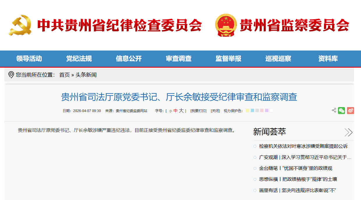 據貴州省紀委監委7日通報,貴州省司法廳原黨委書記、廳長余敏涉嫌嚴重違紀違法,目前正接受貴州省紀委監委紀律審查和監察調查。