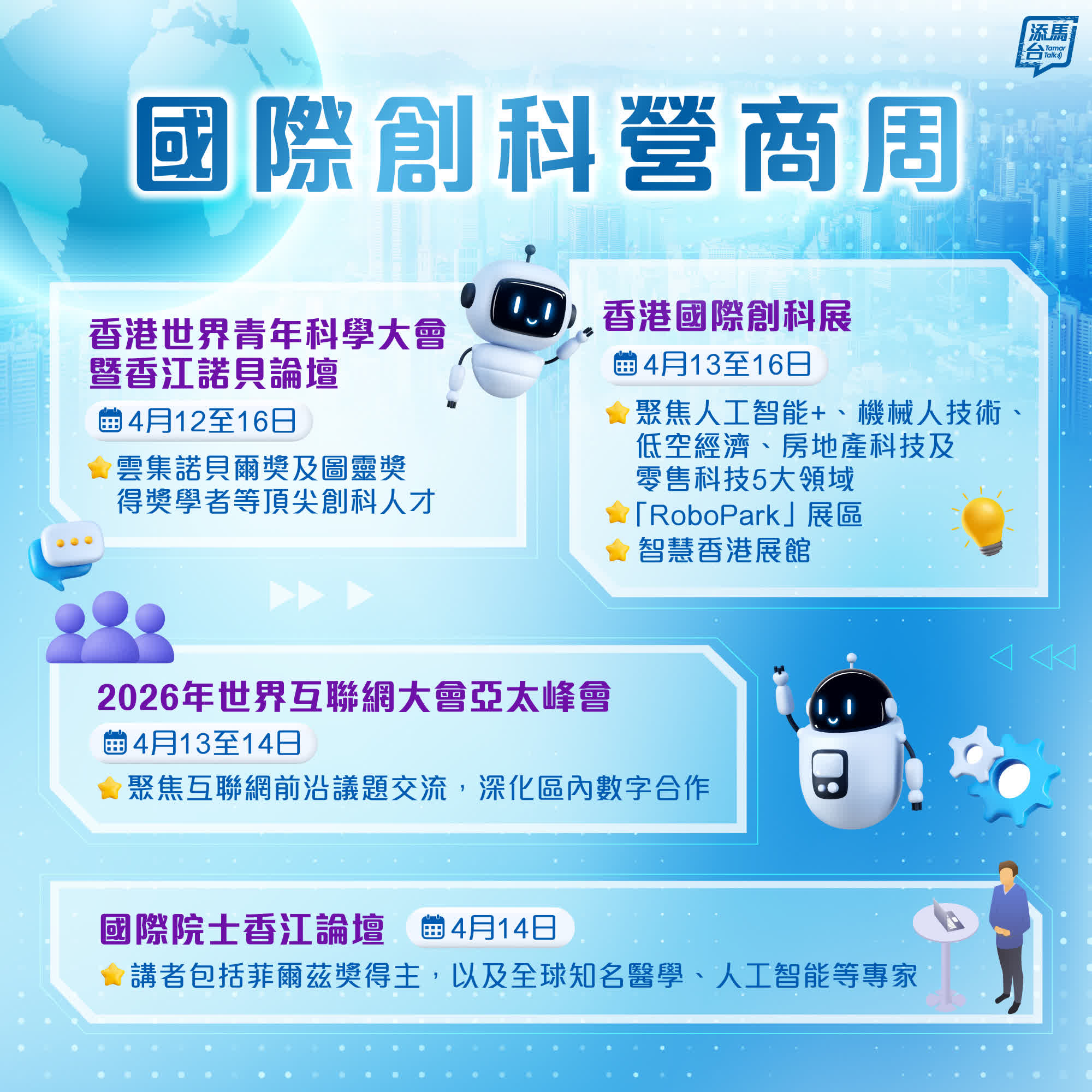 香港文匯報訊(記者 蕭景源)「國際創科營商周」將於4月12日至16日登場,屆時會舉辦多項創科盛事,包括旗艦活動「香港國際創科展」、第三屆「香港世界青年科學大會暨香江諾貝爾論壇」、「國際院士香江論壇」,以及同期舉行的「2026年世界互聯網大會亞太峰會」(見圖),期間匯聚全球創科精英,展示前沿創新成果,深化發展與合作。