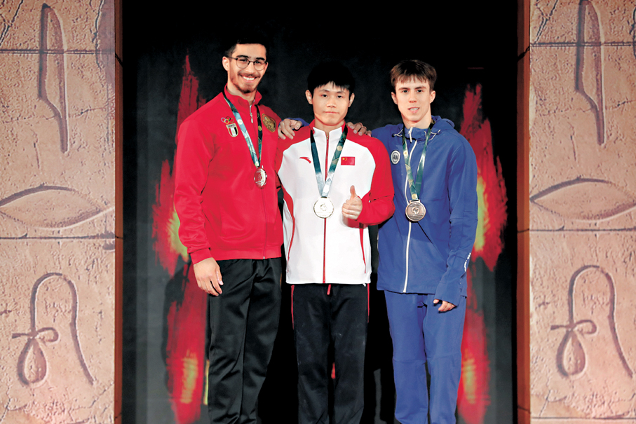 2026年國際體聯體操世界盃開羅站男子雙槓決賽在埃及開羅舉行,中國選手劉洋(中)獲得冠軍。圖為劉洋與亞軍埃及選手阿菲菲(左)和季軍中立運動員杜赫諾在頒獎儀式上合影。