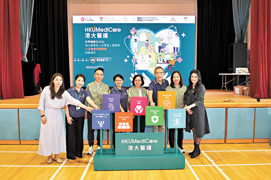 香港文匯報訊(記者 黃子龍)特區政府民政及青年事務局與關愛隊首次夥拍香港大學醫學院,昨日合辦「世界健康日2026:掌握你的健康人生─18區關愛健康巡禮」計劃啟動儀式及首場地區外展健康推廣活動。計劃為期一年,將於全港18區推展社區健康項目,提供免費健康篩查、講座、社區運動體驗及長者與家庭健康諮詢等服務,推廣預防醫學和提升社區整體健康水平,並計劃陸續推出多項針對不同社群需要而設的活動,進一步提升市民健康意識。