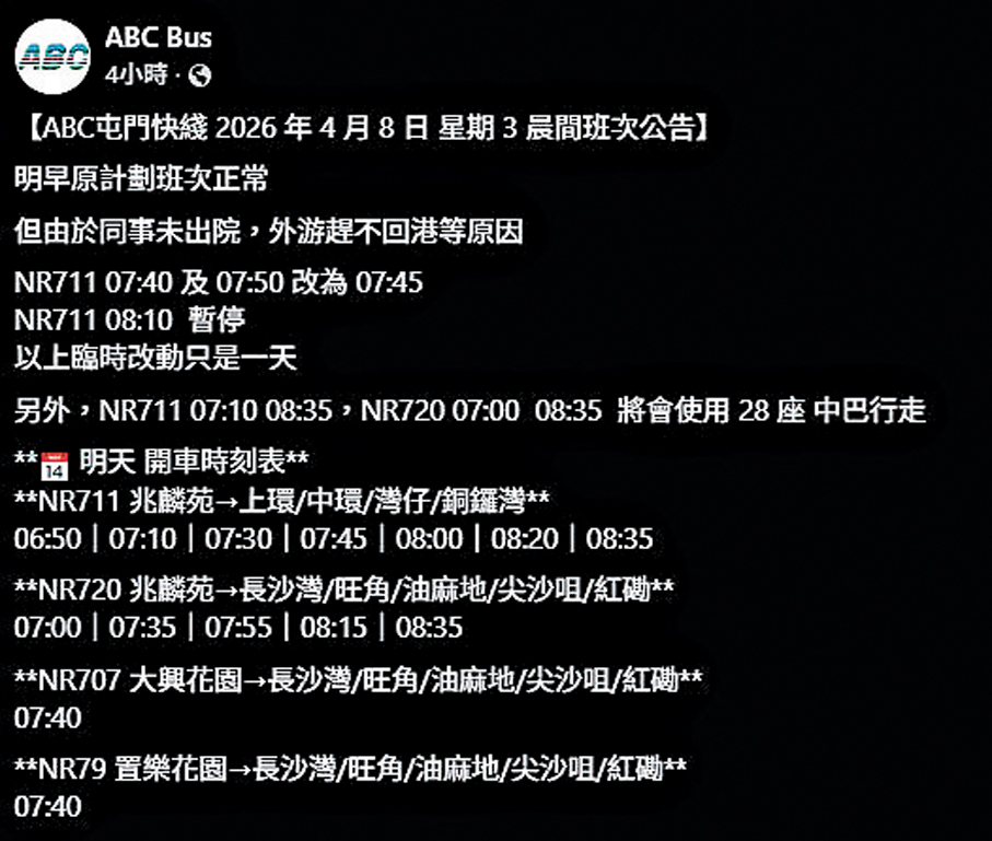 香港文匯報訊 經營屯門四條邨巴路線的ABC旅運,因車用燃油價格上揚,一度聲言要縮減班次,及後被運輸署以事先未獲批准為由叫停減班,但昨日(7日)晚上ABC旅運在社交平台公布,「由於同事未出院,外遊趕不(及)回港等原因」,今早(8日)長假後首個上班日,兆麟苑往港島的NR711班次有兩班次合而為一;另一班早上開出的班次取消,即前後減至七班次,其餘三條路線未有受影響。